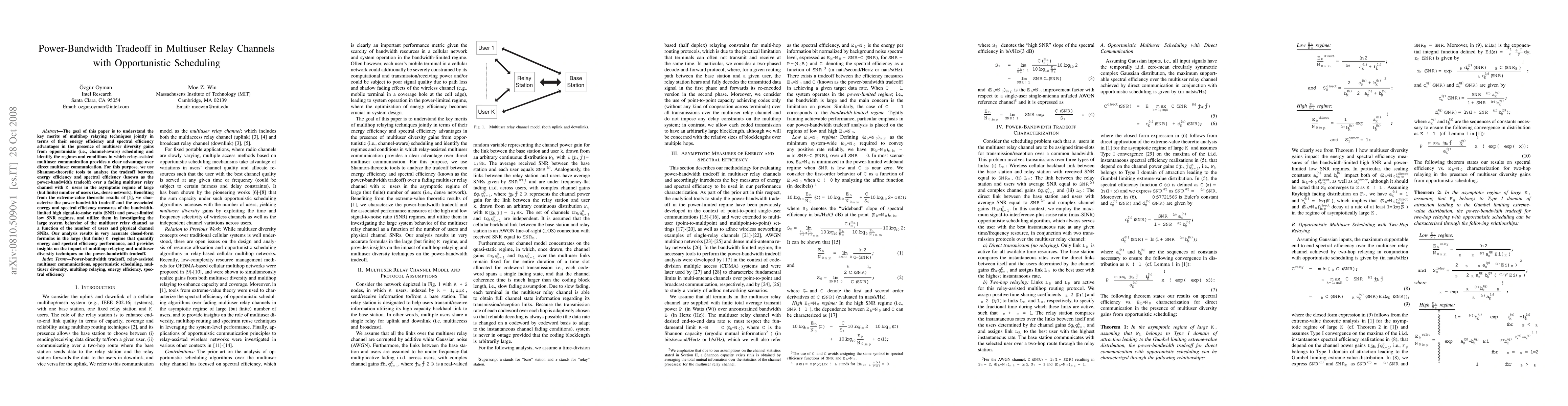 This paper analyzes the power-bandwidth tradeoff in multiuser relay channels with opportunistic scheduling, aiming to identify conditions where relay-assisted communication outperforms direct communication. It uses Shannon-theoretic tools to derive closed-form formulas for energy and spectral efficiency, providing insights into the benefits of multihop relaying and multiuser diversity in dense networks.