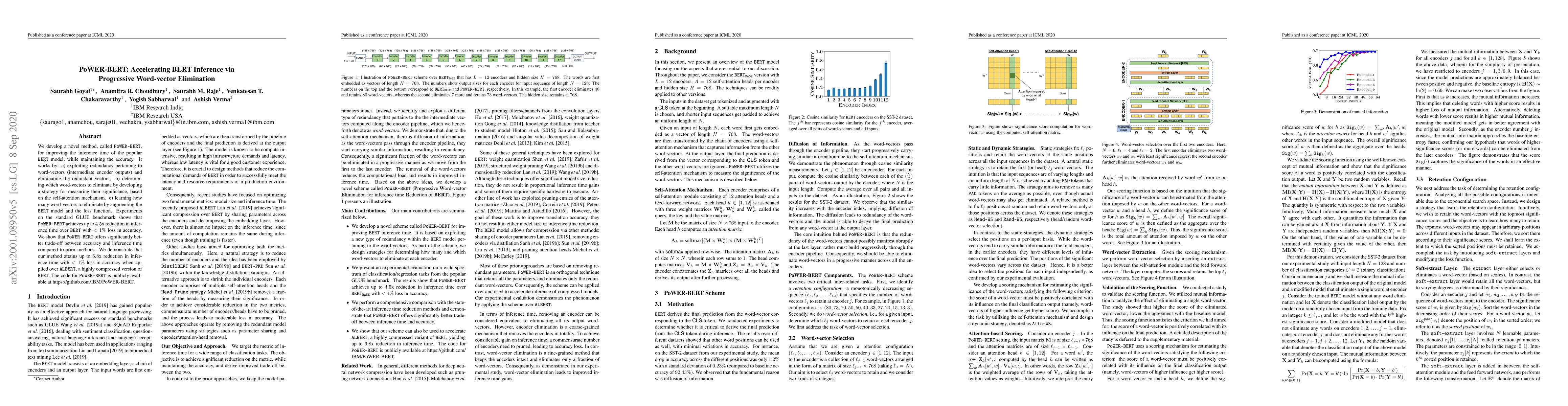 PoWER-BERT introduces a novel method for accelerating BERT inference by eliminating redundant word-vectors using a progressive strategy based on self-attention significance scores, while maintaining accuracy through fine-tuning and a modified loss function.