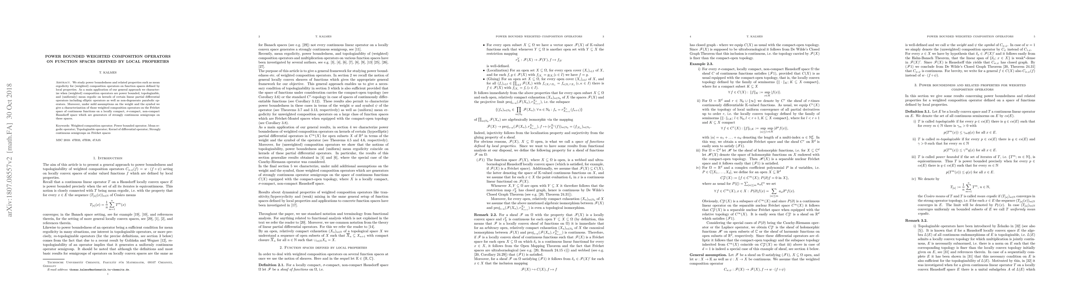 This paper investigates power boundedness and related properties for weighted composition operators on function spaces defined by local properties. It characterizes when these operators are power bounded, topologizable, and mean ergodic, particularly in the context of kernels of elliptic and non-degenerate parabolic partial differential operators.