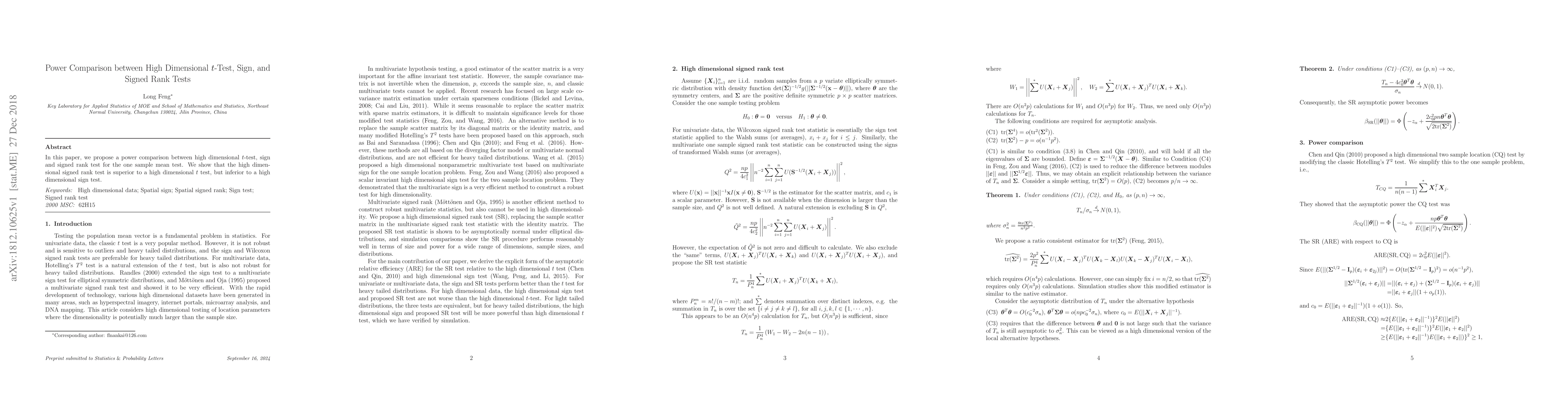 Summary: This research compares the power of high-dimensional one sample mean tests, concluding that the signed rank test is more powerful than the t-test but less powerful than the sign test.