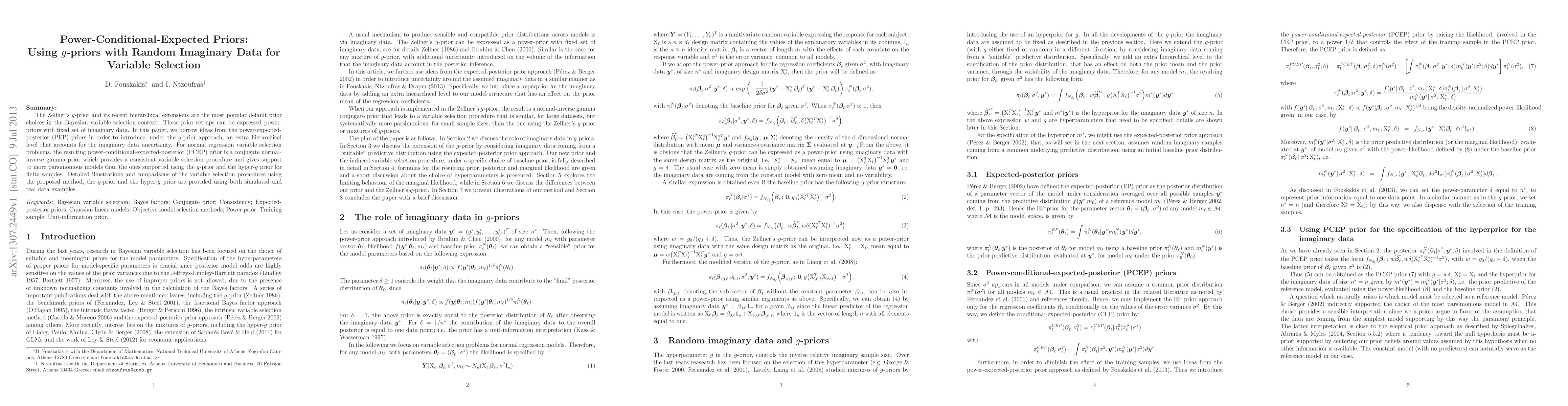 This paper introduces a power-conditional-expected-posterior (PCEP) prior based on Zellner's g-prior, incorporating an extra hierarchical level to account for uncertainty in imaginary data, leading to more parsimonious variable selection in normal regression problems. The method is shown to be consistent and outperform g-prior and hyper-g prior in both simulated and real data examples.