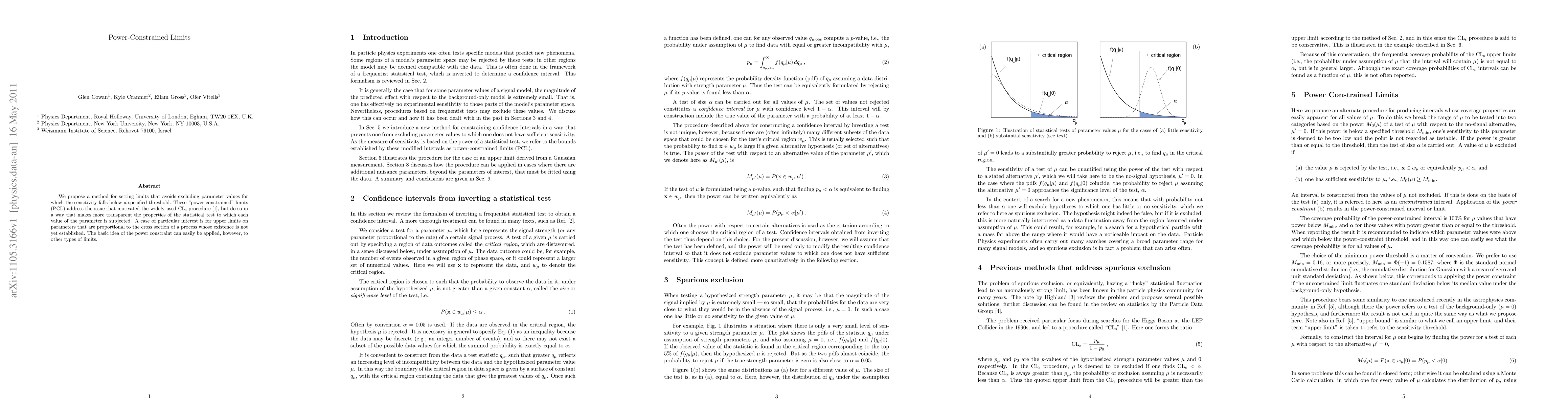 Researchers propose a new method called 'Power-Constrained Limits' to set statistical limits while avoiding exclusion of certain parameter values. This approach provides more transparent properties of the test and can be applied to various types of limits, including upper limits for parameters proportional to process cross-sections.