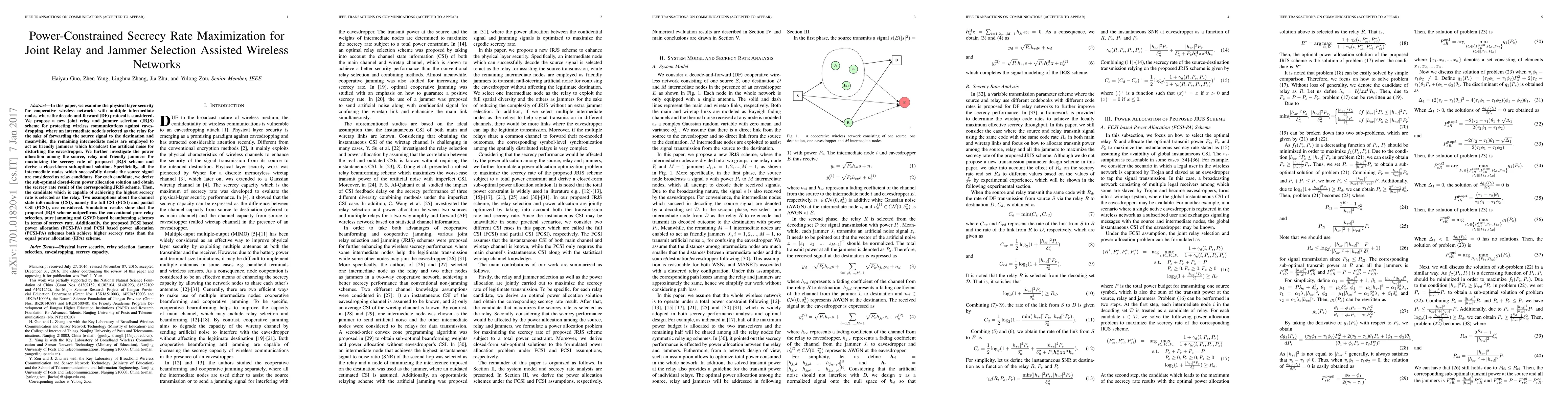 This paper proposes a joint relay and jammer selection scheme to enhance physical layer security in cooperative wireless networks using the decode-and-forward protocol. It develops a sub-optimal solution for power allocation to maximize secrecy rate, showing superior performance over conventional methods under both full and partial channel state information.