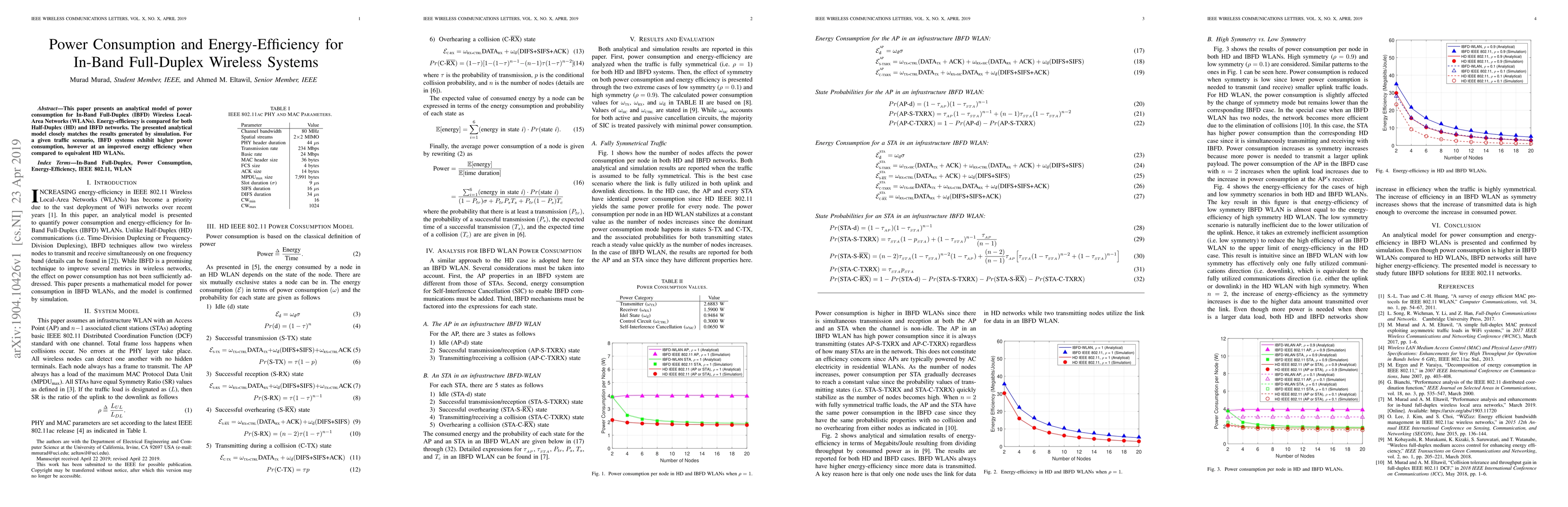 This paper develops an analytical model for power consumption in In-Band Full-Duplex WLANs, comparing energy efficiency with Half-Duplex networks. Despite higher power usage, IBFD systems show better energy efficiency than HD WLANs under the same traffic conditions.