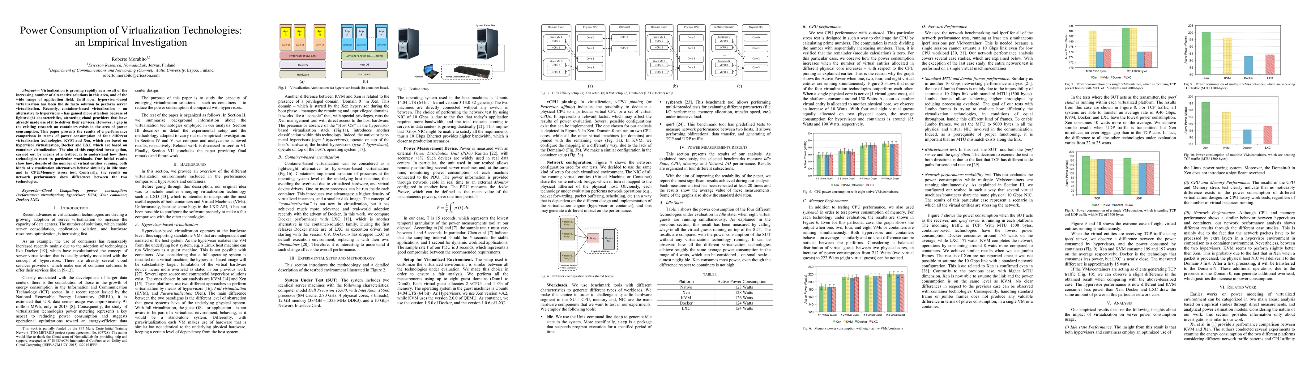 This paper compares the power consumption of four virtualization technologies: KVM, Xen, Docker, and LXC. The study finds that hypervisor-based and container-based virtualization show similar power consumption in idle and stress tests, but differences emerge in network performance.