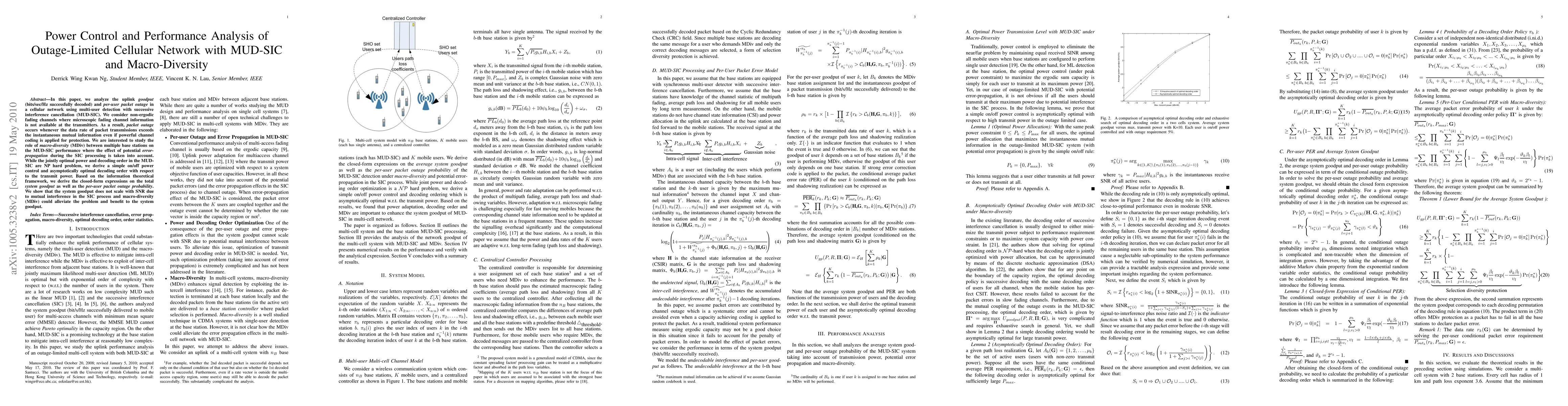 This paper analyzes the uplink goodput and per-user packet outage in an outage-limited cellular network using MUD-SIC, considering non-ergodic fading channels. It explores the impact of macro-diversity between base stations on MUD-SIC performance, deriving a simple power control and optimal decoding order, and showing that macro-diversity can improve system goodput despite mutual interference.