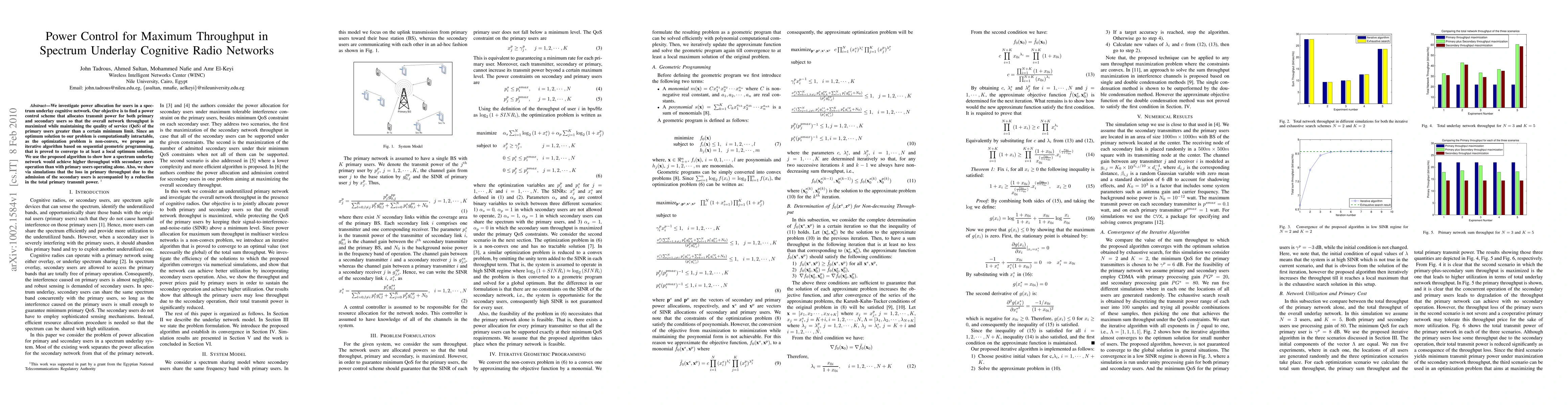 This paper proposes an iterative algorithm for power allocation in spectrum underlay cognitive radio networks to maximize throughput while ensuring primary users' quality of service. The algorithm, based on sequential geometric programming, converges to a local optimum, demonstrating higher throughput with secondary users compared to primary users alone, with reduced primary transmit power.