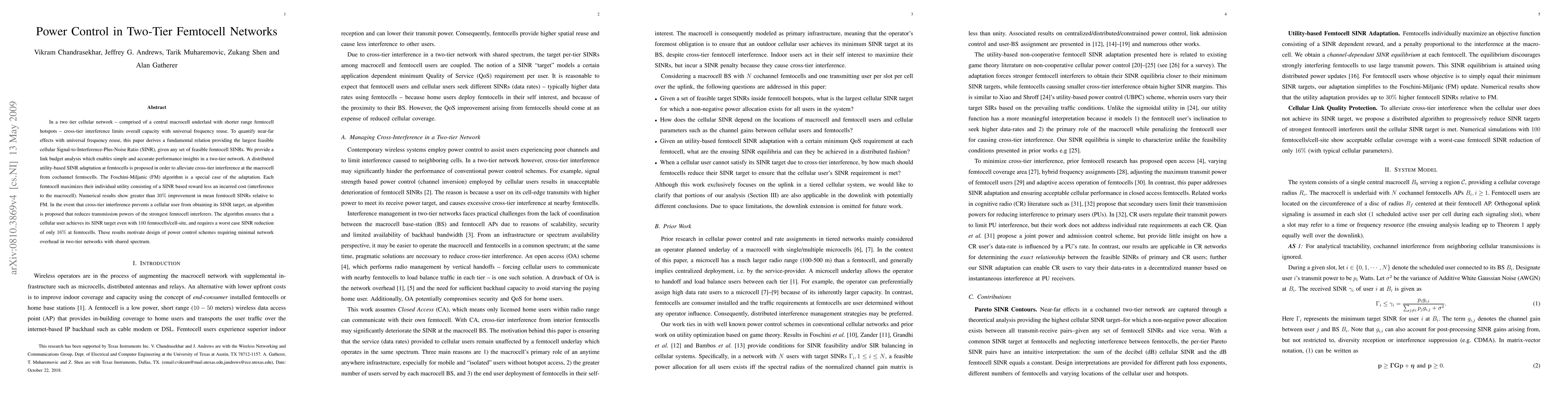 This paper proposes a distributed utility-based power control scheme for femtocells in two-tier networks to mitigate cross-tier interference and improve Signal-to-Interference-Plus-Noise Ratio (SINR). It also introduces a power reduction algorithm for femtocells to ensure macrocell users meet their SINR targets, achieving over 30% improvement in femtocell SINRs.