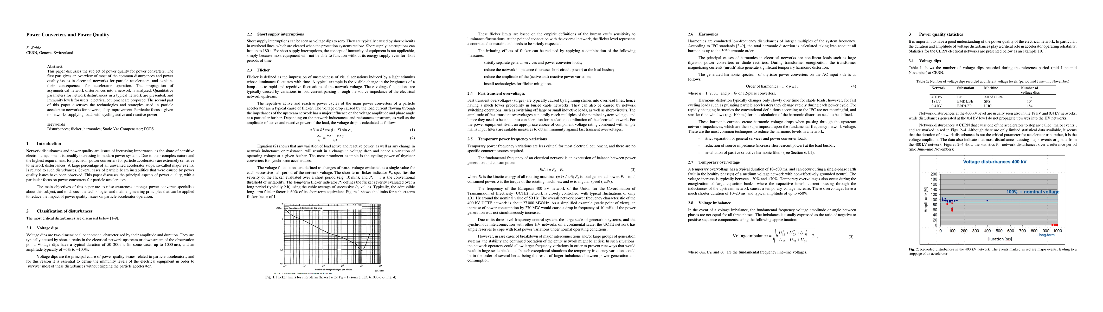 This paper discusses the subject of power quality for power converters. The first part gives an overview of most of the common disturbances and power quality issues in electrical networks for particle accelerators, and explains their consequences for accelerator operation. The propagation of asymmetrical network disturbances into a network is analysed. Quantitative parameters for network disturbances in a typical network are presented, and immunity levels for users' electrical equipment are proposed. The second part of this paper discusses the technologies and strategies used in particle accelerator networks for power quality improvement. Particular focus is given to networks supplying loads with cycling active and reactive power.