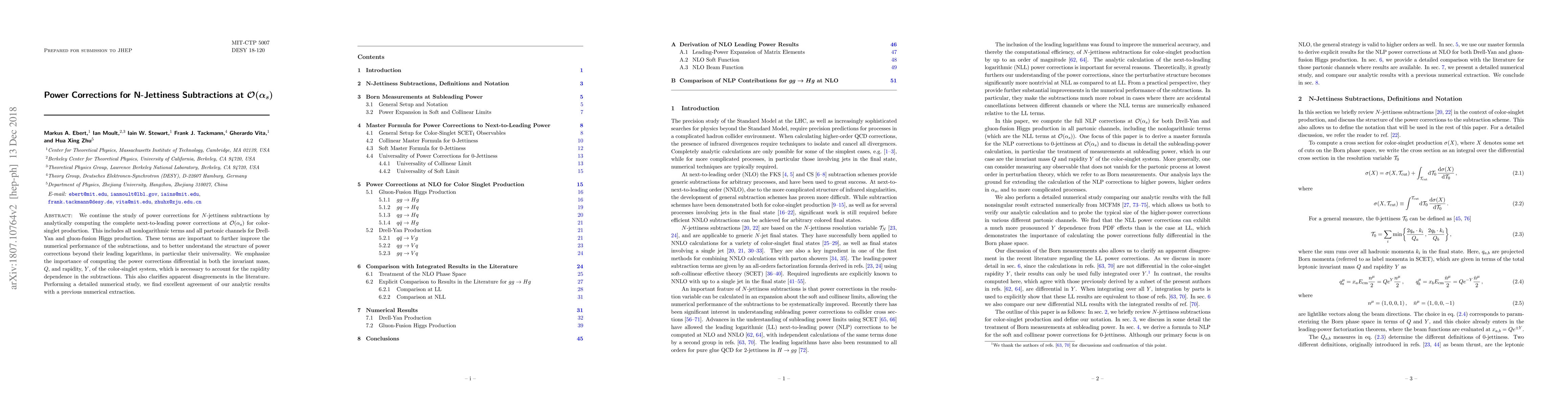 We continue the study of power corrections for $N$-jettiness subtractions by analytically computing the complete next-to-leading power corrections at $\cal{O}(\alpha_s)$ for color-singlet production. This includes all nonlogarithmic terms and all partonic channels for Drell-Yan and gluon-fusion Higgs production. These terms are important to further improve the numerical performance of the subtractions, and to better understand the structure of power corrections beyond their leading logarithms, in particular their universality. We emphasize the importance of computing the power corrections differential in both the invariant mass, $Q$, and rapidity, $Y$, of the color-singlet system, which is necessary to account for the rapidity dependence in the subtractions. This also clarifies apparent disagreements in the literature. Performing a detailed numerical study, we find excellent agreement of our analytic results with a previous numerical extraction.
