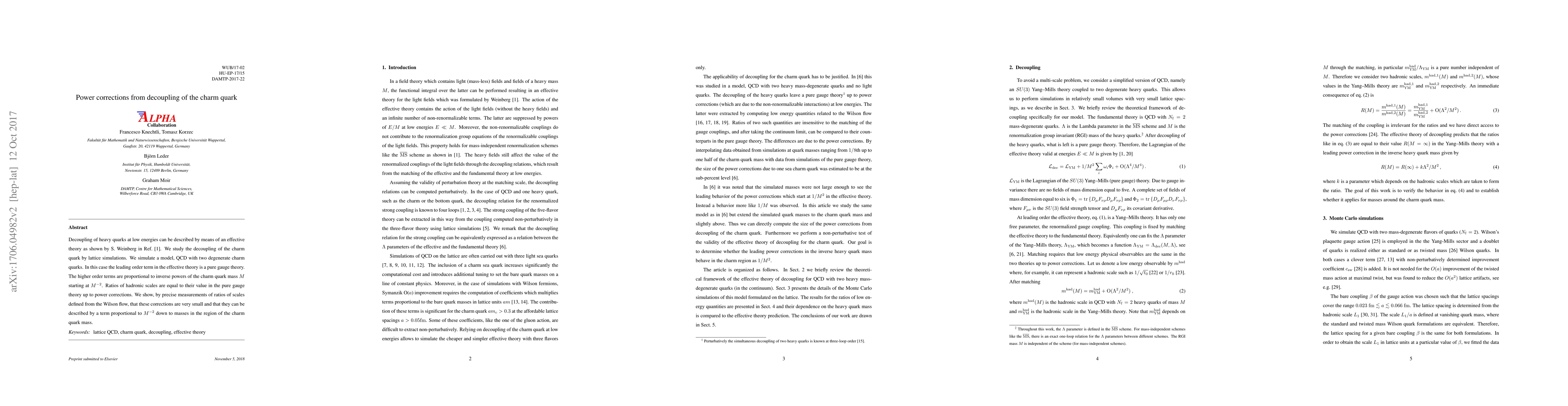 Decoupling of heavy quarks at low energies can be described by means of an effective theory as shown by S. Weinberg in Ref. [1]. We study the decoupling of the charm quark by lattice simulations. We simulate a model, QCD with two degenerate charm quarks. In this case the leading order term in the effective theory is a pure gauge theory. The higher order terms are proportional to inverse powers of the charm quark mass $M$ starting at $M^{-2}$. Ratios of hadronic scales are equal to their value in the pure gauge theory up to power corrections. We show, by precise measurements of ratios of scales defined from the Wilson flow, that these corrections are very small and that they can be described by a term proportional to $M^{-2}$ down to masses in the region of the charm quark mass.