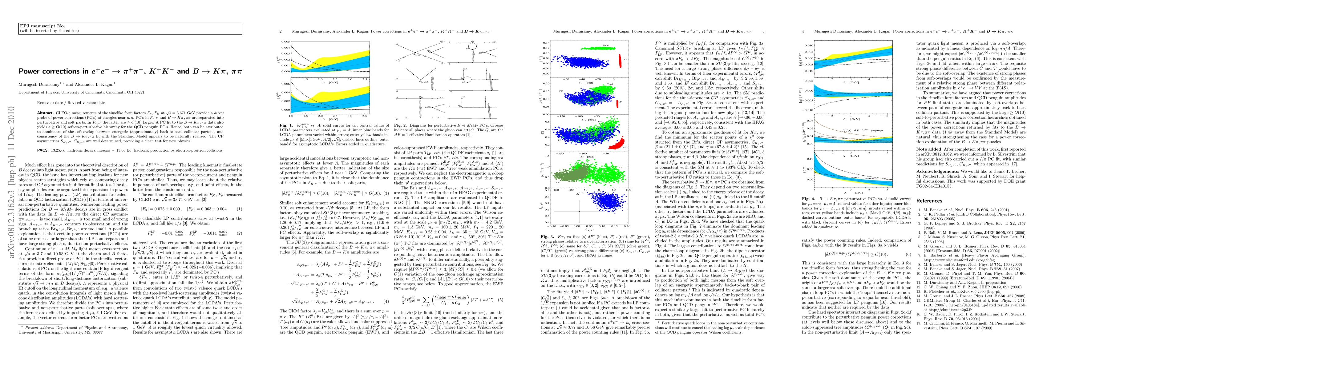CLEO-c measurements of the timelike form factors F_pi, F_K at \sqrt{s}=3.671 GeV provide a direct probe of power corrections (PC's) at energies near m_B. PC's in F_pi, F_K and B \to K pi, pi pi are separated into perturbative and soft parts. In F_pi, F_K the latter are \ge O(10) larger. A PC fit to the B \to K pi, pi pi data also yields a \ge O(10) soft-to-perturbative hierarchy for the QCD penguin PC's. Hence, both can be attributed to dominance of the soft-ovelap between energetic (approximately) back-to-back collinear partons, and consistency of the B\to K pi, pi pi fit with the Standard Model appears to be naturally realized. The CP asymmetries S_{K_s pi^0}, C_{K_s pi^0} are well determined, providing a clean test for new physics.