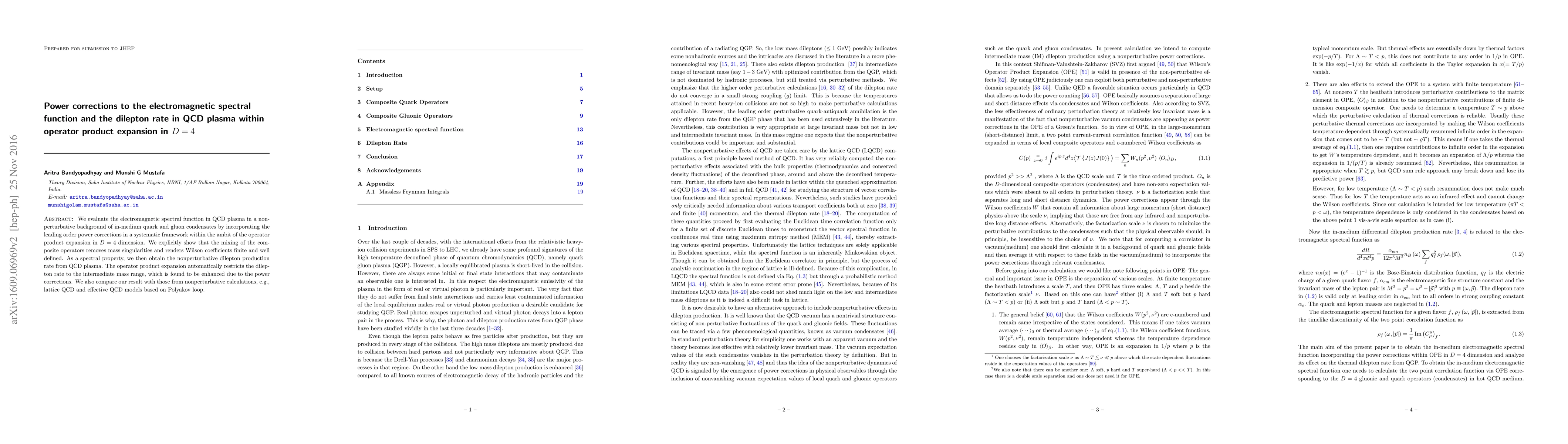 We evaluate the electromagnetic spectral function in QCD plasma in a nonperturbative background of in-medium quark and gluon condensates by incorporating the leading order power corrections in a systematic framework within the ambit of the operator product expansion in D=4 dimension. We explicitly show that the mixing of the composite operators removes mass singularities and renders Wilson coefficients finite and well defined. As a spectral property, we then obtain the nonperturbative dilepton production rate from QCD plasma. The operator product expansion automatically restricts the dilepton rate to the intermediate mass range, which is found to be enhanced due to the power corrections. We also compare our result with those from nonperturbative calculations, e.g., lattice QCD and effective QCD models based on Polyakov loop.