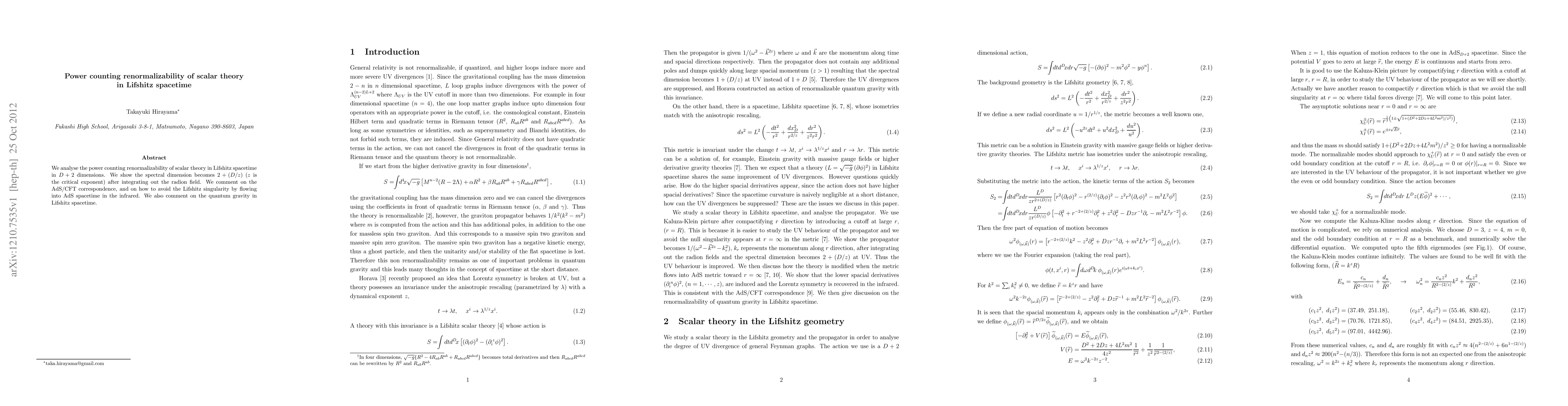 This paper examines the power counting renormalizability of scalar theories in Lifshitz spacetime, revealing that the spectral dimension adjusts to 2+(D/z) after integrating out the radion field. It discusses the implications for the AdS/CFT correspondence and suggests avoiding Lifshitz singularities by transitioning to AdS spacetime in the infrared.