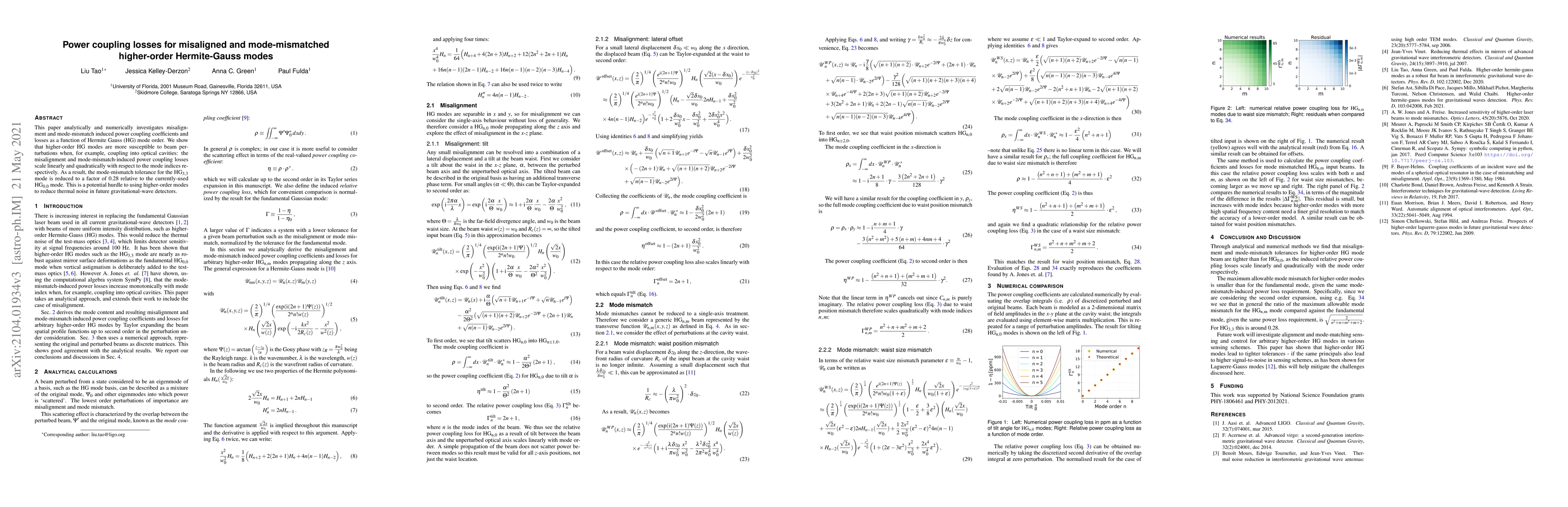 The paper presents analytical derivations and numerical comparisons of power coupling coefficients and losses for misaligned and mode-mismatched higher-order Hermite-Gauss modes, extending previous work by Jones et al. to include misalignment effects.