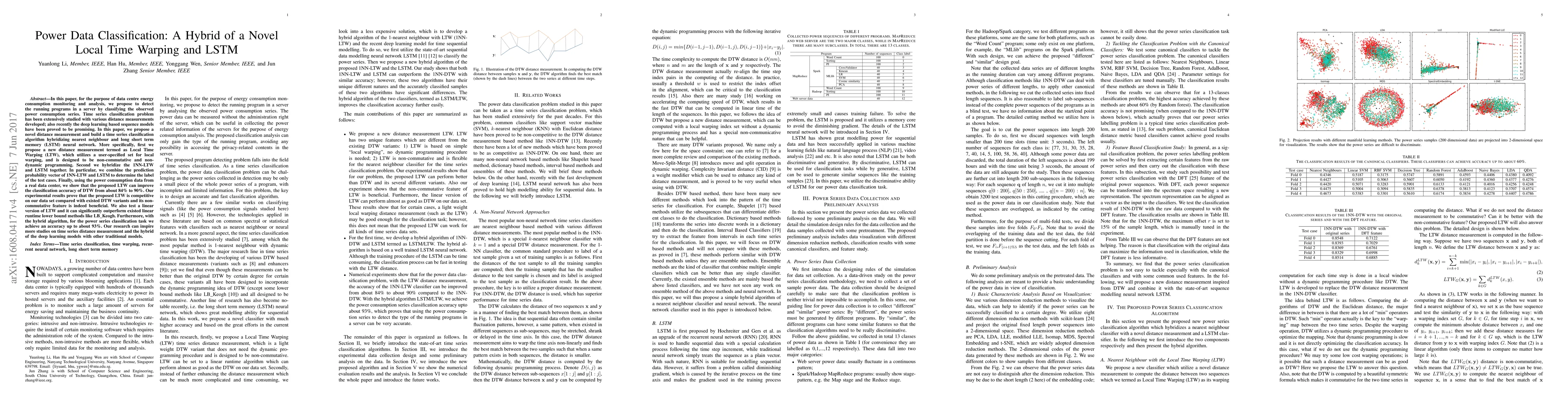 In this paper, for the purpose of data centre energy consumption monitoring and analysis, we propose to detect the running programs in a server by classifying the observed power consumption series. Time series classification problem has been extensively studied with various distance measurements developed; also recently the deep learning based sequence models have been proved to be promising. In this paper, we propose a novel distance measurement and build a time series classification algorithm hybridizing nearest neighbour and long short term memory (LSTM) neural network. More specifically, first we propose a new distance measurement termed as Local Time Warping (LTW), which utilizes a user-specified set for local warping, and is designed to be non-commutative and non-dynamic programming. Second we hybridize the 1NN-LTW and LSTM together. In particular, we combine the prediction probability vector of 1NN-LTW and LSTM to determine the label of the test cases. Finally, using the power consumption data from a real data center, we show that the proposed LTW can improve the classification accuracy of DTW from about 84% to 90%. Our experimental results prove that the proposed LTW is competitive on our data set compared with existed DTW variants and its non-commutative feature is indeed beneficial. We also test a linear version of LTW and it can significantly outperform existed linear runtime lower bound methods like LB_Keogh. Furthermore, with the hybrid algorithm, for the power series classification task we achieve an accuracy up to about 93%. Our research can inspire more studies on time series distance measurement and the hybrid of the deep learning models with other traditional models.
