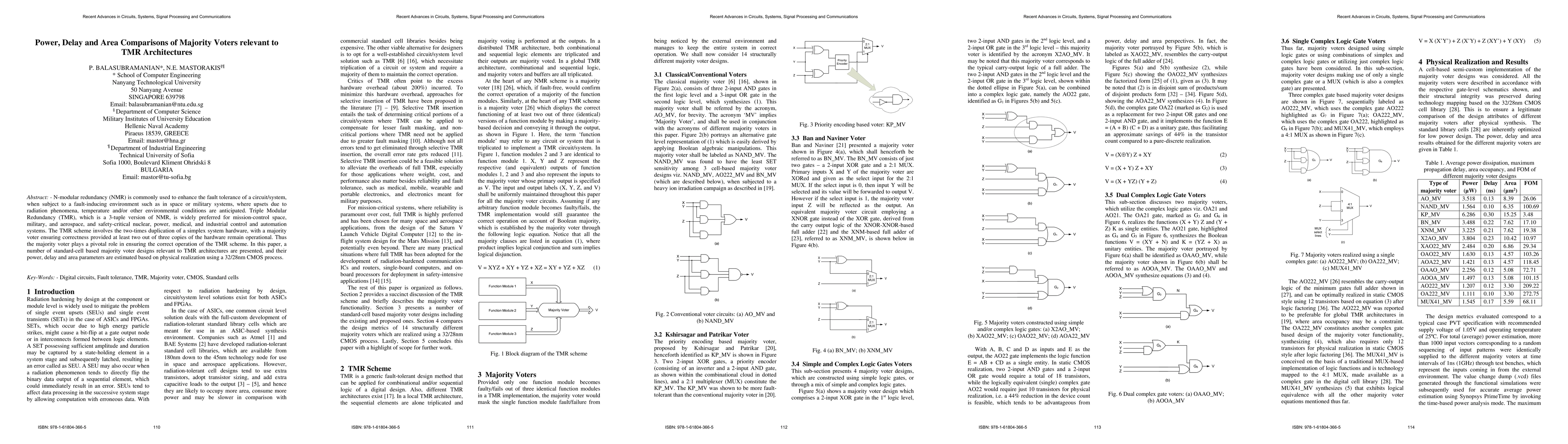 N-modular redundancy (NMR) is commonly used to enhance the fault tolerance of a circuit/system, when subject to a fault-inducing environment such as in space or military systems, where upsets due to radiation phenomena, temperature and/or other environmental conditions are anticipated. Triple Modular Redundancy (TMR), which is a 3-tuple version of NMR, is widely preferred for mission-control space, military, and aerospace, and safety-critical nuclear, power, medical, and industrial control and automation systems. The TMR scheme involves the two-times duplication of a simplex system hardware, with a majority voter ensuring correctness provided at least two out of three copies of the hardware remain operational. Thus the majority voter plays a pivotal role in ensuring the correct operation of the TMR scheme. In this paper, a number of standard-cell based majority voter designs relevant to TMR architectures are presented, and their power, delay and area parameters are estimated based on physical realization using a 32/28nm CMOS process.