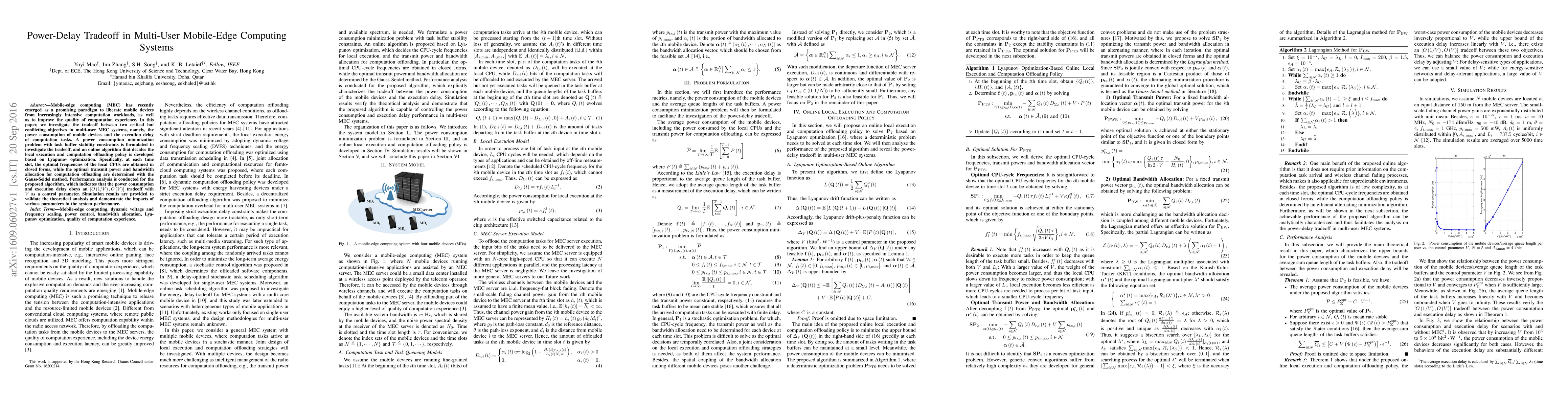 This paper explores the power-delay tradeoff in multi-user mobile-edge computing systems, formulating a power minimization problem with task buffer stability constraints. An online algorithm based on Lyapunov optimization and Gauss-Seidel method is developed to determine local execution and offloading policies, revealing an [O (1/V); O (V)] tradeoff between power and delay with V as a control parameter.