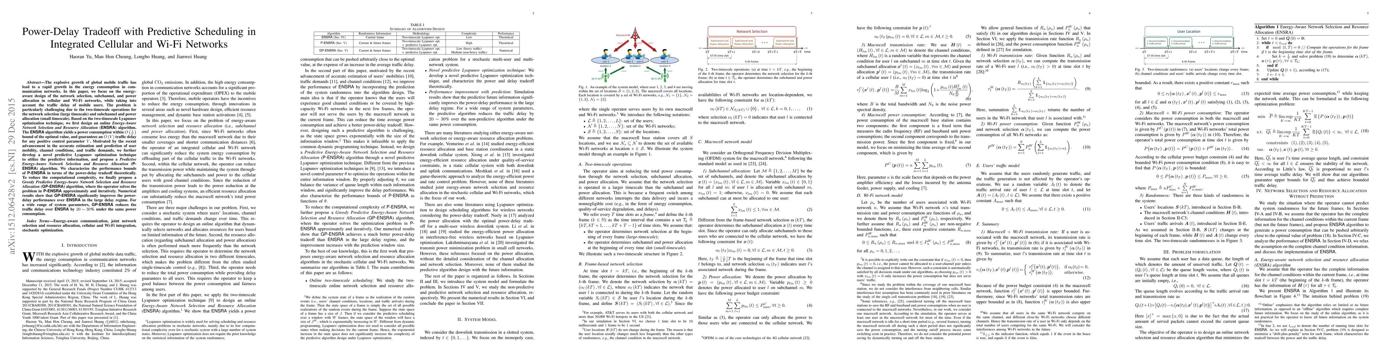 This paper proposes algorithms for optimizing the power-delay tradeoff in integrated cellular and Wi-Fi networks, focusing on energy-aware network selection and resource allocation. The Greedy Predictive Energy-Aware Network Selection and Resource Allocation (GP-ENSRA) algorithm significantly reduces traffic delay by 20~30% compared to the baseline ENSRA algorithm, while maintaining similar power consumption.