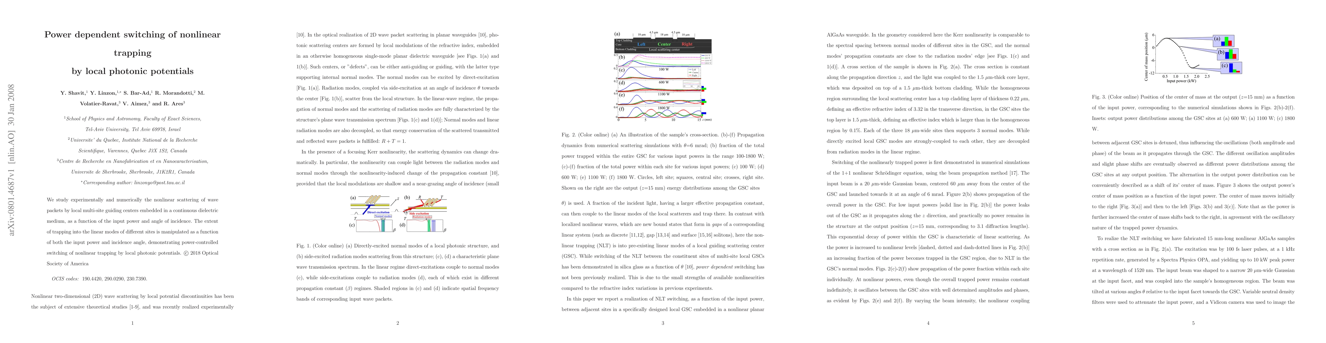 This paper investigates the nonlinear scattering of wave packets in a dielectric medium, showing that trapping into different guiding sites can be controlled by both input power and incidence angle, thus enabling power-dependent switching of nonlinear trapping by local photonic potentials.