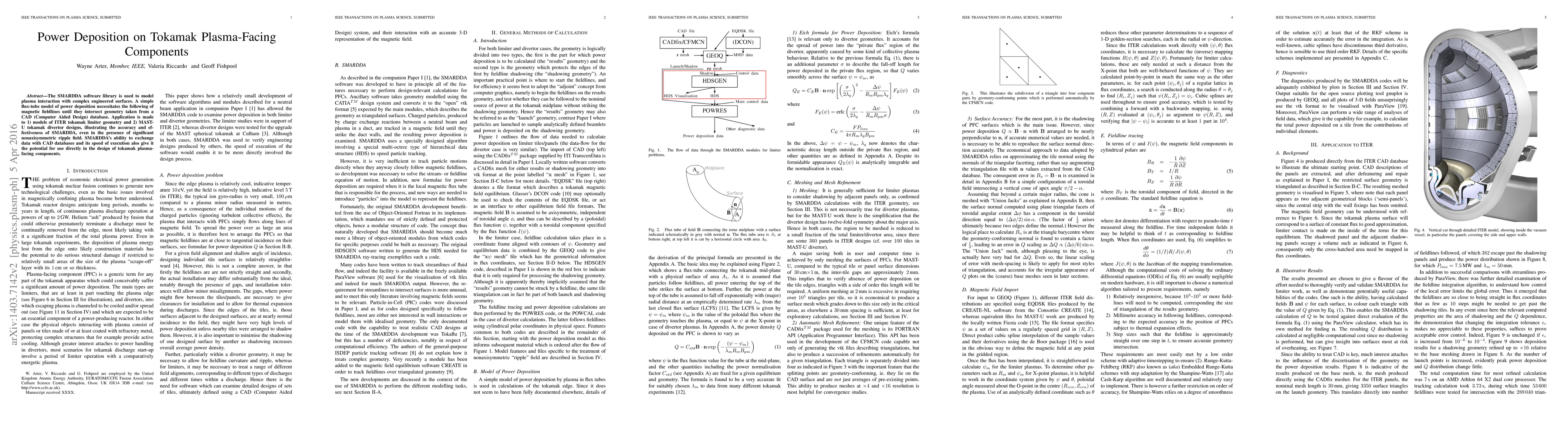 This paper uses the SMARDDA software library to model power deposition on tokamak plasma-facing components by simulating plasma interaction with engineered surfaces. The study applies this model to ITER and MASTU tokamak designs, demonstrating its accuracy and effectiveness, especially in complex geometries.