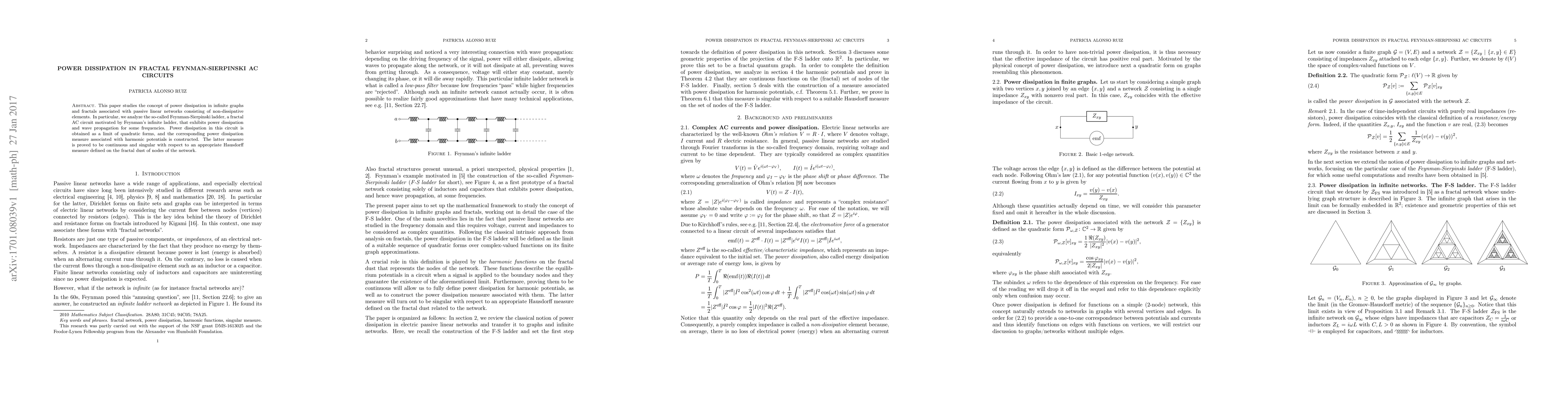 This paper studies the concept of power dissipation in infinite graphs and fractals associated with passive linear networks consisting of non-dissipative elements. In particular, we analyze the so-called Feynman-Sierpinski ladder, a fractal AC circuit motivated by Feynman's infinite ladder, that exhibits power dissipation and wave propagation for some frequencies. Power dissipation in this circuit is obtained as a limit of quadratic forms, and the corresponding power dissipation measure associated with harmonic potentials is constructed. The latter measure is proved to be continuous and singular with respect to an appropriate Hausdorff measure defined on the fractal dust of nodes of the network.