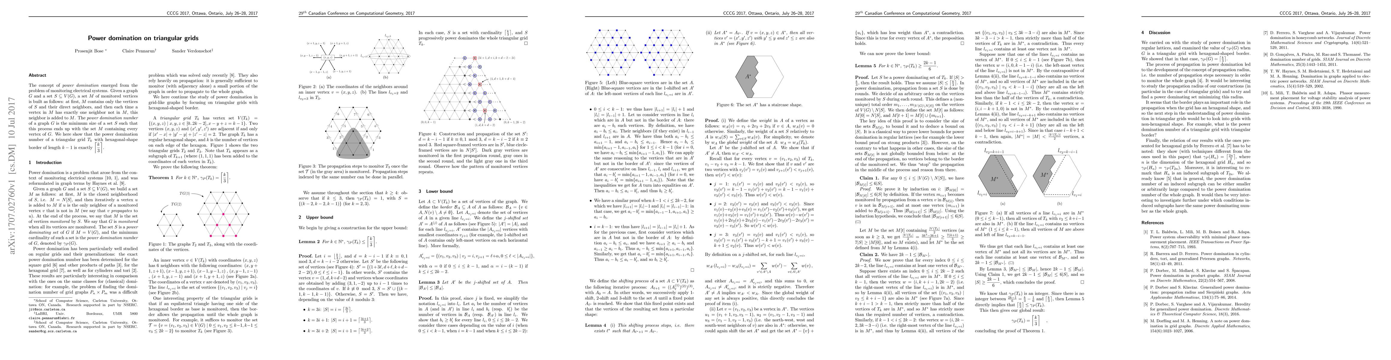 The concept of power domination emerged from the problem of monitoring electrical systems. Given a graph G and a set S $\subseteq$ V (G), a set M of monitored vertices is built as follows: at first, M contains only the vertices of S and their direct neighbors, and then each time a vertex in M has exactly one neighbor not in M, this neighbor is added to M. The power domination number of a graph G is the minimum size of a set S such that this process ends up with the set M containing every vertex of G. We here show that the power domination number of a triangular grid T\_k with hexagonal-shape border of length k -- 1 is exactly $\lceil k/3 \rceil.