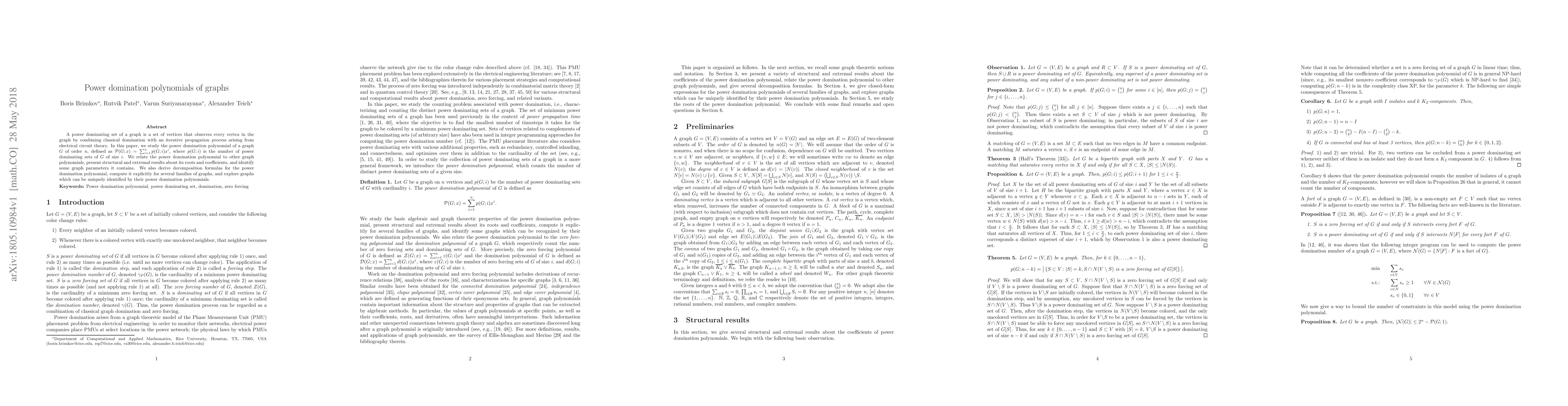 The introduction and analysis of power domination polynomials, along with their relationships to other graph polynomials and structural characterizations.