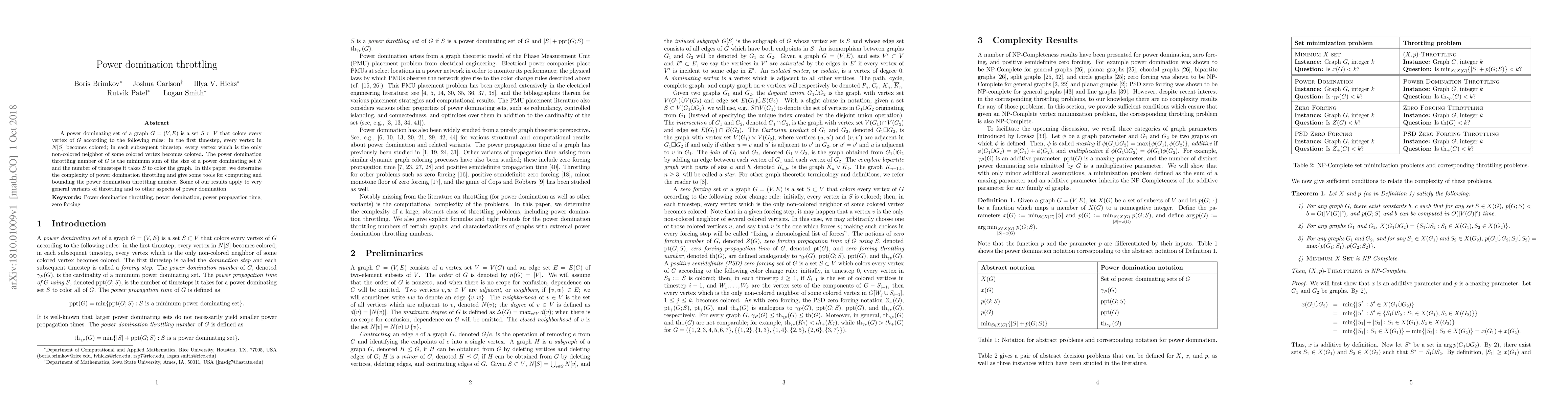 A power dominating set of a graph $G=(V,E)$ is a set $S\subset V$ that colors every vertex of $G$ according to the following rules: in the first timestep, every vertex in $N[S]$ becomes colored; in each subsequent timestep, every vertex which is the only non-colored neighbor of some colored vertex becomes colored. The power domination throttling number of $G$ is the minimum sum of the size of a power dominating set $S$ and the number of timesteps it takes $S$ to color the graph. In this paper, we determine the complexity of power domination throttling and give some tools for computing and bounding the power domination throttling number. Some of our results apply to very general variants of throttling and to other aspects of power domination.