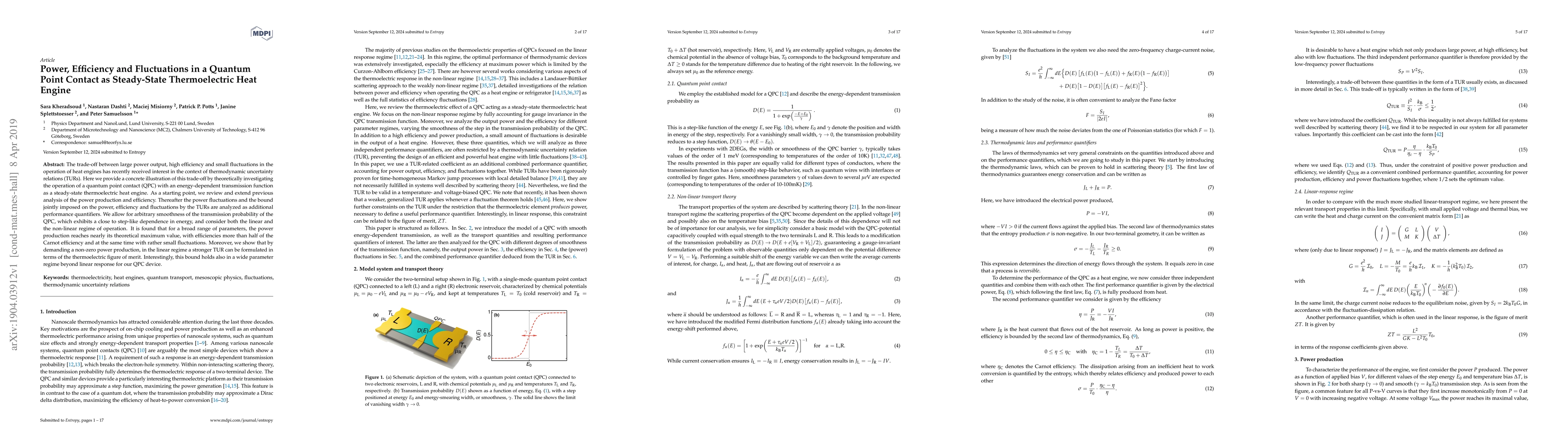 A quantum point contact is analyzed as a thermoelectric heat engine to optimize power output, efficiency, and fluctuations, demonstrating that high performance can be achieved simultaneously in a wide range of operating conditions.