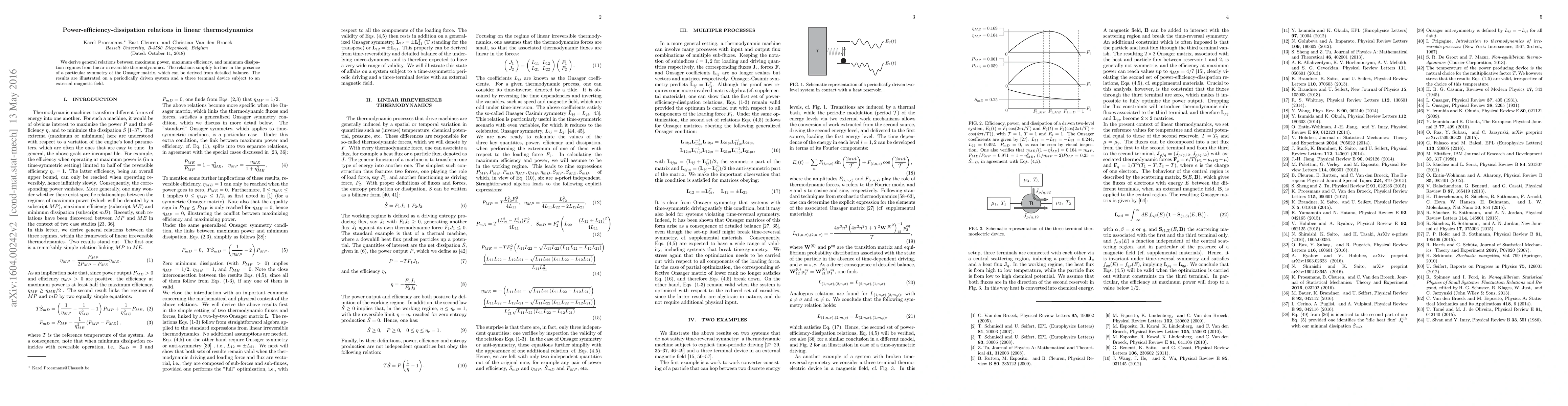 We derive general relations between maximum power, maximum efficiency, and minimum dissipation regimes from linear irreversible thermodynamics. The relations simplify further in the presence of a particular symmetry of the Onsager matrix, which can be derived from detailed balance. The results are illustrated on a periodically driven system and a three terminal device subject to an external magnetic field.