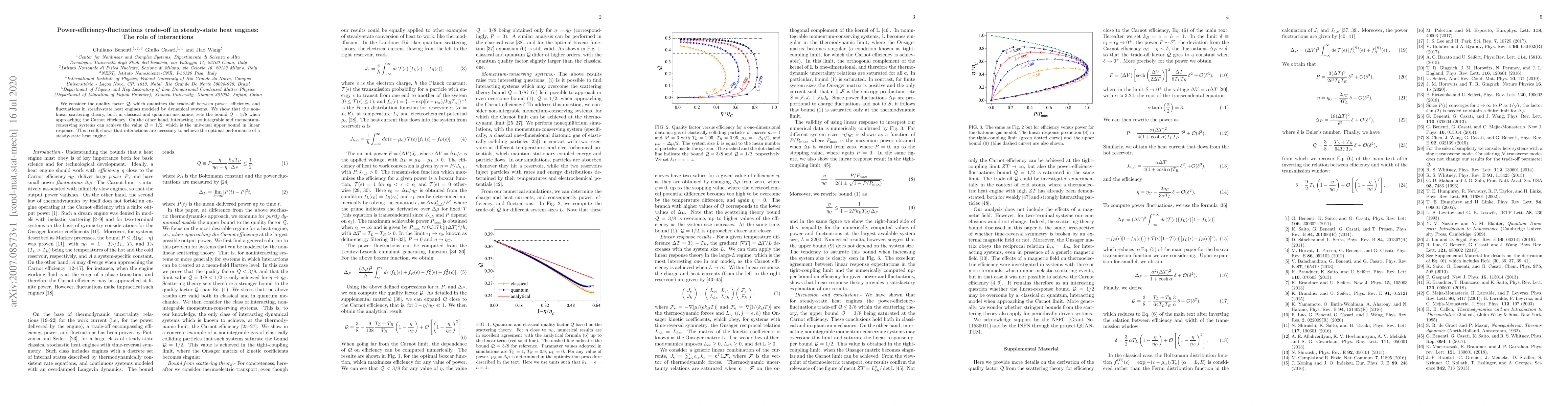 This paper investigates the trade-off between power, efficiency, and fluctuations in steady-state heat engines, demonstrating that interactions in nonintegrable systems can achieve an optimal performance bound Q=1/2, surpassing the classical bound of Q=3/8 set by nonlinear scattering theory. Interactions are thus essential for optimal engine performance.