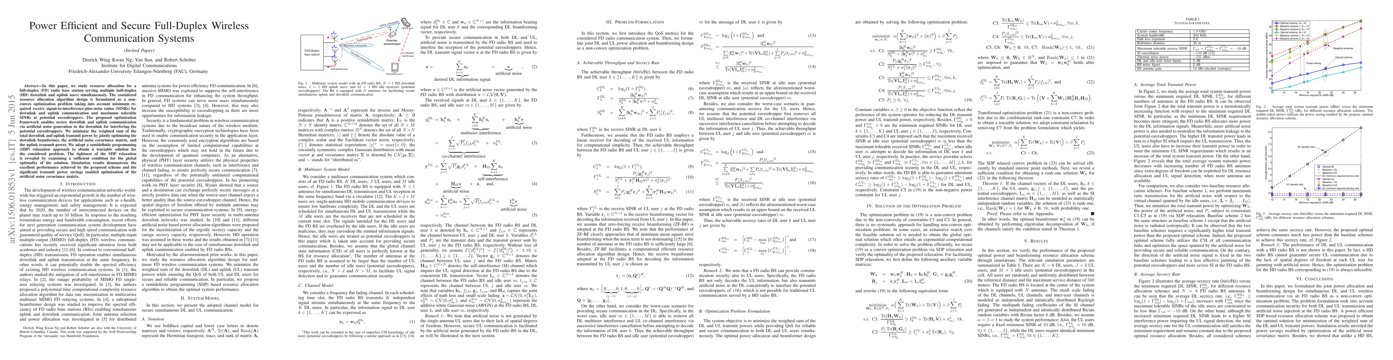 This paper proposes an optimization framework for resource allocation in full-duplex radio base stations, aiming to minimize transmit power while ensuring secure communication through artificial noise generation. The approach uses semidefinite programming to solve the non-convex problem, achieving significant power savings and secure communication.