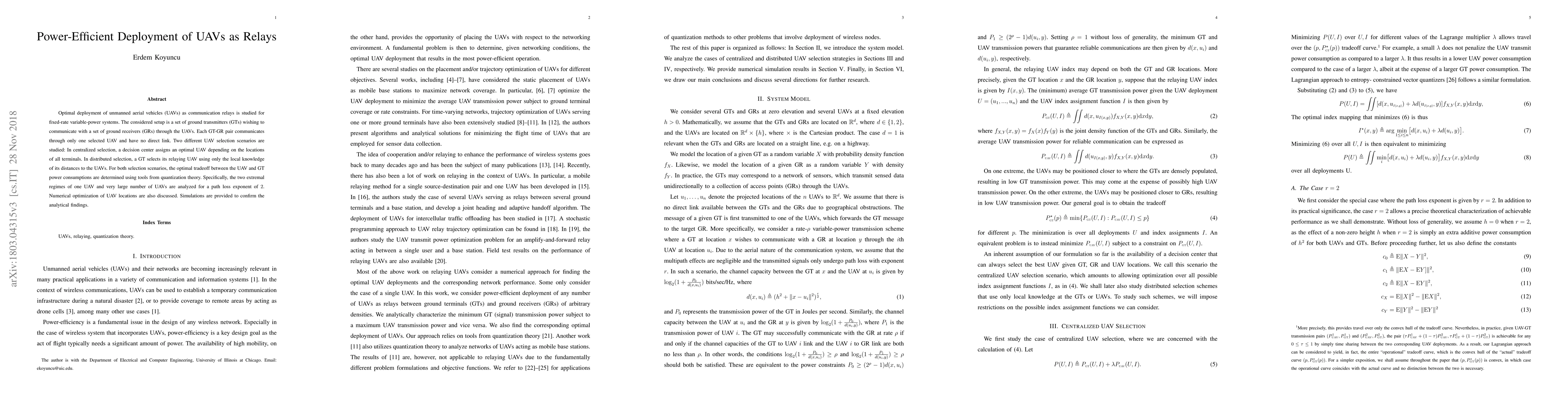 Researchers studied optimal deployment of drones as communication relays to balance power consumption between ground transmitters and receivers. They found that centralized selection can achieve better tradeoffs than decentralized selection for certain scenarios.