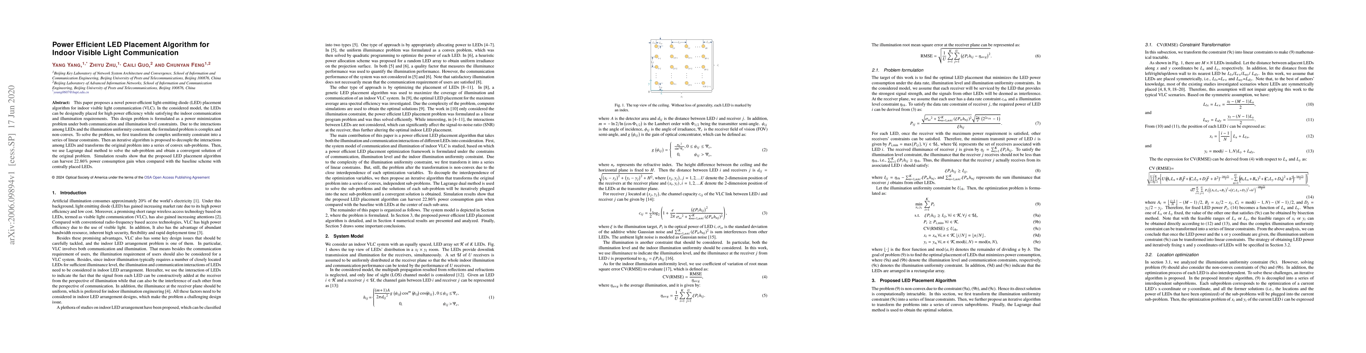 This paper introduces a novel power-efficient LED placement algorithm for indoor visible light communication, transforming complex constraints into linear ones and solving via an iterative method and Lagrange dual approach. The proposed algorithm achieves a 22.86% reduction in power consumption compared to centrally placed LEDs.