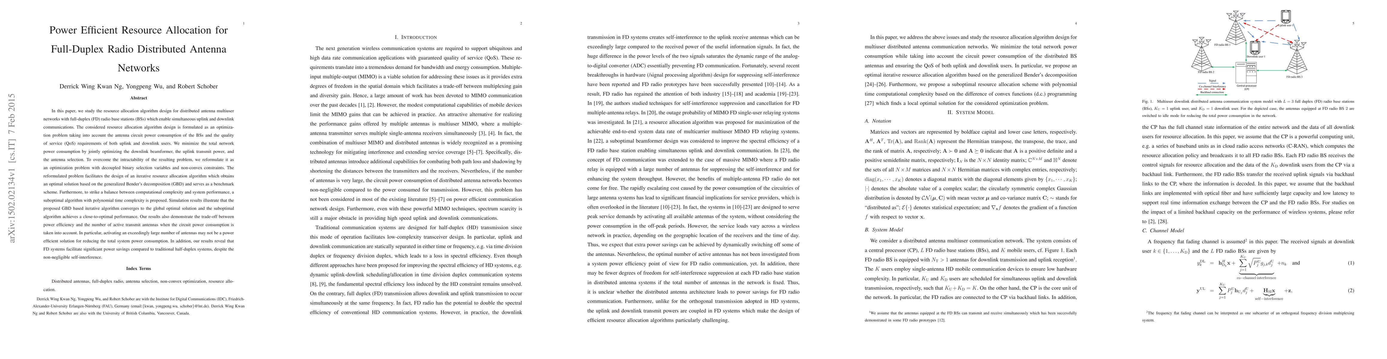 This paper proposes resource allocation algorithms for full-duplex distributed antenna networks, optimizing power consumption while meeting QoS requirements. It introduces an optimal iterative algorithm based on generalized Bender's decomposition and a suboptimal polynomial-time algorithm for practical deployment, demonstrating significant power savings in full-duplex systems compared to half-duplex, despite self-interference.