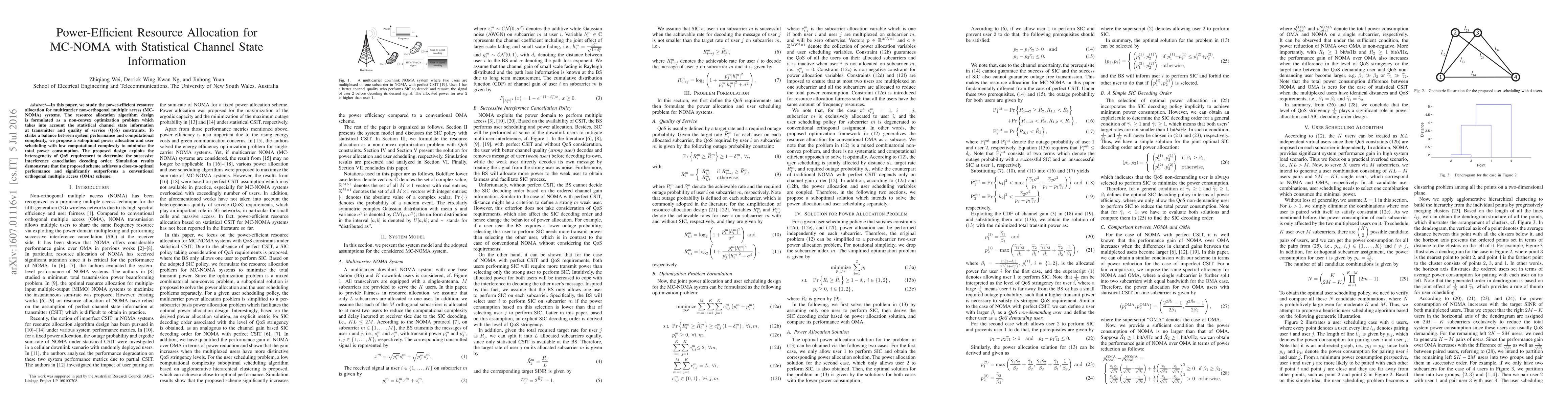 This paper proposes a power-efficient resource allocation algorithm for multicarrier non-orthogonal multiple access (MC-NOMA) systems, leveraging statistical channel state information and QoS constraints. The suboptimal approach minimizes power consumption while maintaining performance, outperforming conventional orthogonal multiple access (OMA) methods.