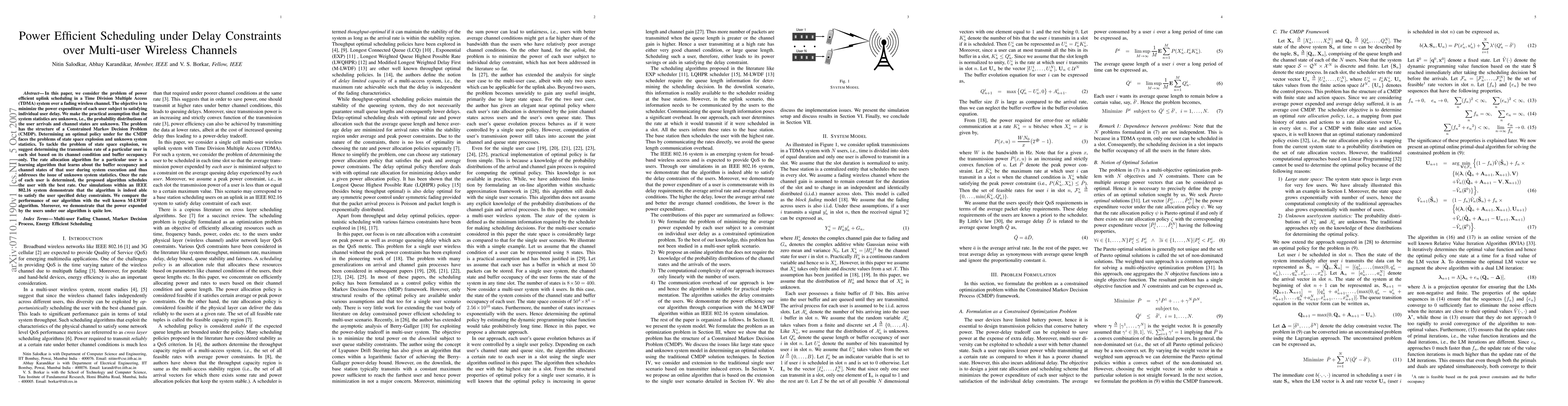 In this paper, we consider the problem of power efficient uplink scheduling in a Time Division Multiple Access (TDMA) system over a fading wireless channel. The objective is to minimize the power expenditure of each user subject to satisfying individual user delay. We make the practical assumption that the system statistics are unknown, i.e., the probability distributions of the user arrivals and channel states are unknown. The problem has the structure of a Constrained Markov Decision Problem (CMDP). Determining an optimal policy under for the CMDP faces the problems of state space explosion and unknown system statistics. To tackle the problem of state space explosion, we suggest determining the transmission rate of a particular user in each slot based on its channel condition and buffer occupancy only. The rate allocation algorithm for a particular user is a learning algorithm that learns about the buffer occupancy and channel states of that user during system execution and thus addresses the issue of unknown system statistics. Once the rate of each user is determined, the proposed algorithm schedules the user with the best rate. Our simulations within an IEEE 802.16 system demonstrate that the algorithm is indeed able to satisfy the user specified delay constraints. We compare the performance of our algorithm with the well known M-LWDF algorithm. Moreover, we demonstrate that the power expended by the users under our algorithm is quite low.