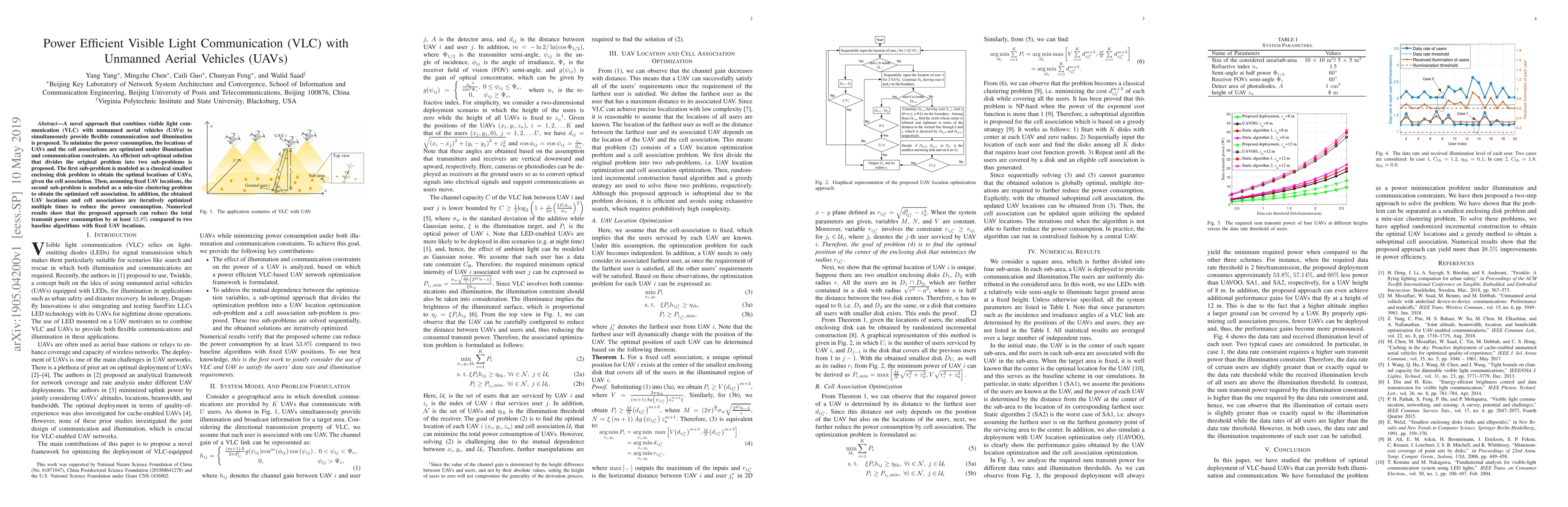 This paper proposes a power-efficient visible light communication (VLC) system using UAVs that optimizes UAV locations and cell associations to minimize power consumption. The approach divides the optimization into two sub-problems: one for optimal UAV placement and another for optimized cell association, achieving at least a 53.8% reduction in power consumption compared to baseline methods.