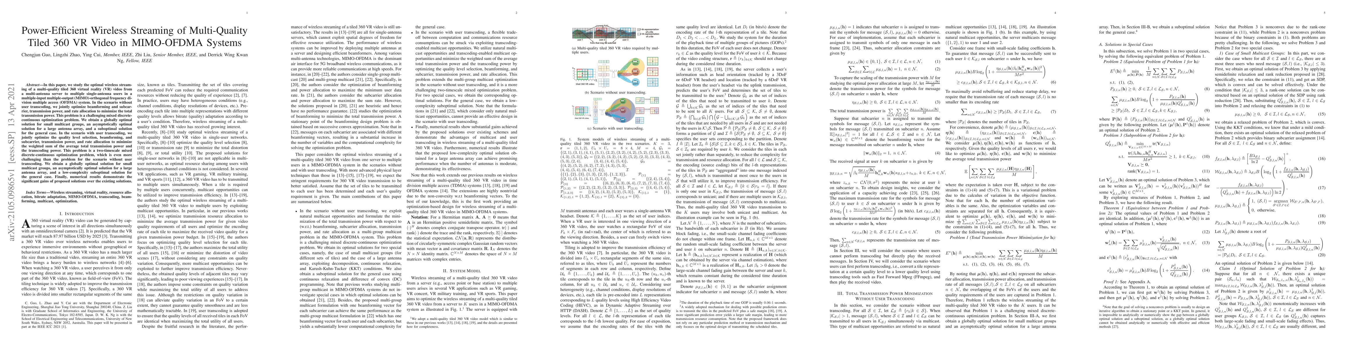 This paper investigates power-efficient wireless streaming of multi-quality tiled 360 VR video in MIMO-OFDMA systems, optimizing beamforming, subcarrier, power, and rate allocation to minimize transmission power. Solutions include globally optimal, asymptotically optimal, and low-complexity suboptimal methods for both transcoding and non-transcoding scenarios.