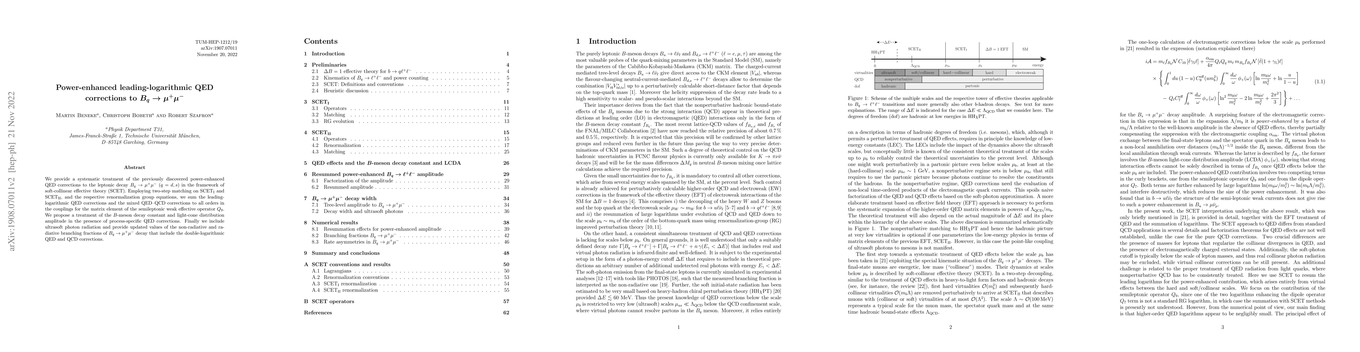 This paper systematically analyzes power-enhanced QED corrections in the decay $B_q \to \mu^+\mu^-$ using SCET, summing leading-logarithmic QED and mixed QED-QCD corrections. It also proposes a treatment for $B$-meson decay constants and distribution amplitudes under QED effects, and provides updated branching fractions for the decay including double-logarithmic corrections.