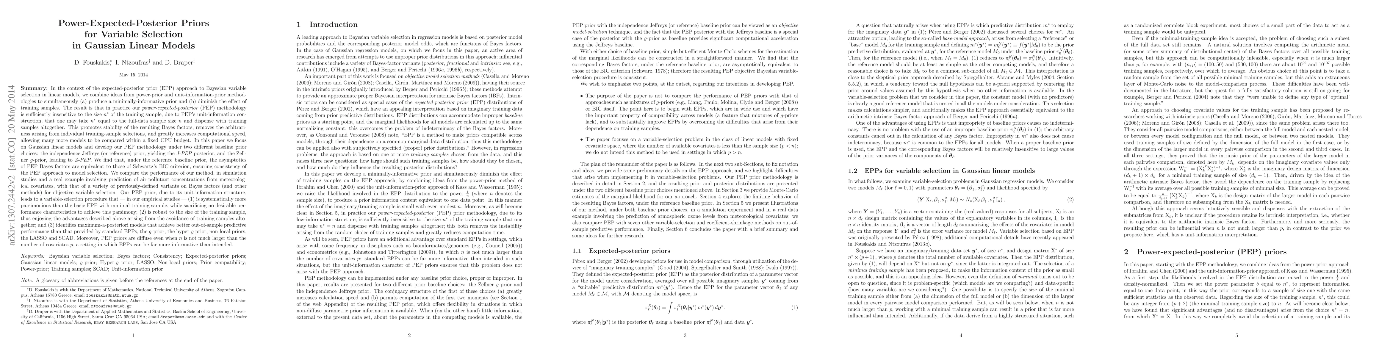 This paper introduces power-expected-posterior (PEP) priors for Bayesian variable selection in Gaussian linear models, combining power-prior and unit-information-prior methodologies to achieve a minimally-informative prior that is robust to training sample size. The PEP approach is shown to be consistent with the BIC criterion and outperforms other variable selection methods in simulations and real-world applications.