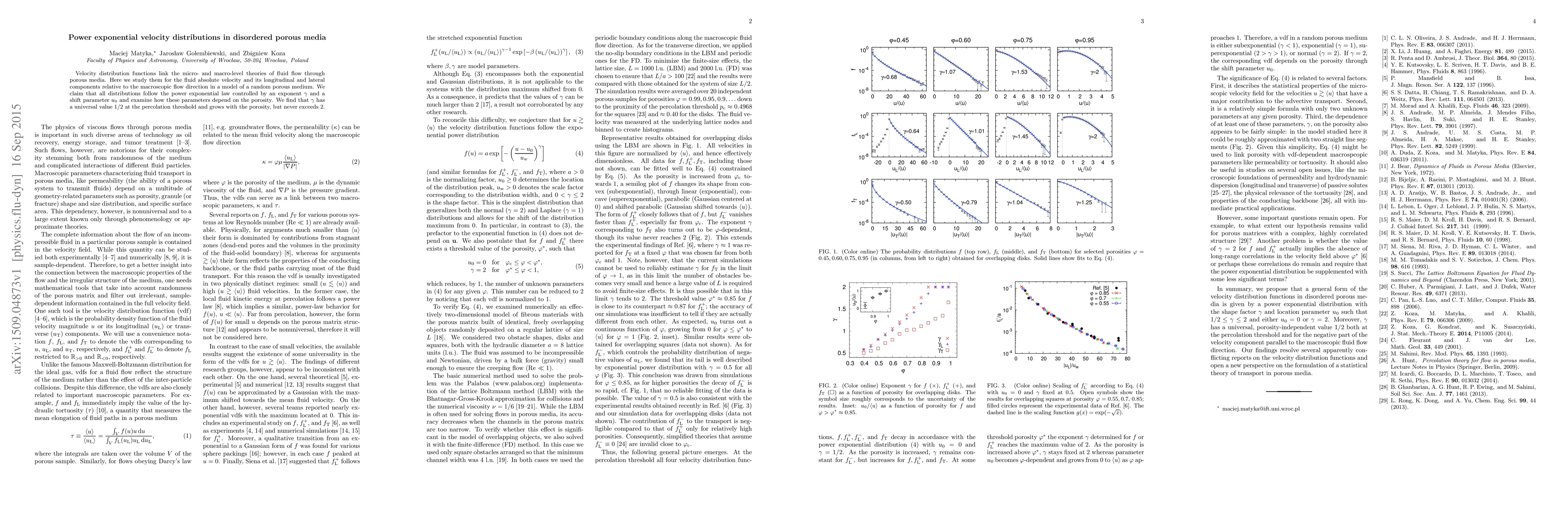 This paper investigates velocity distribution functions in disordered porous media, finding that all distributions follow a power exponential law with a universal exponent of $1/2$ at the percolation threshold, which increases with porosity but does not exceed 2. The study examines the fluid's absolute and component velocities relative to macroscopic flow direction.