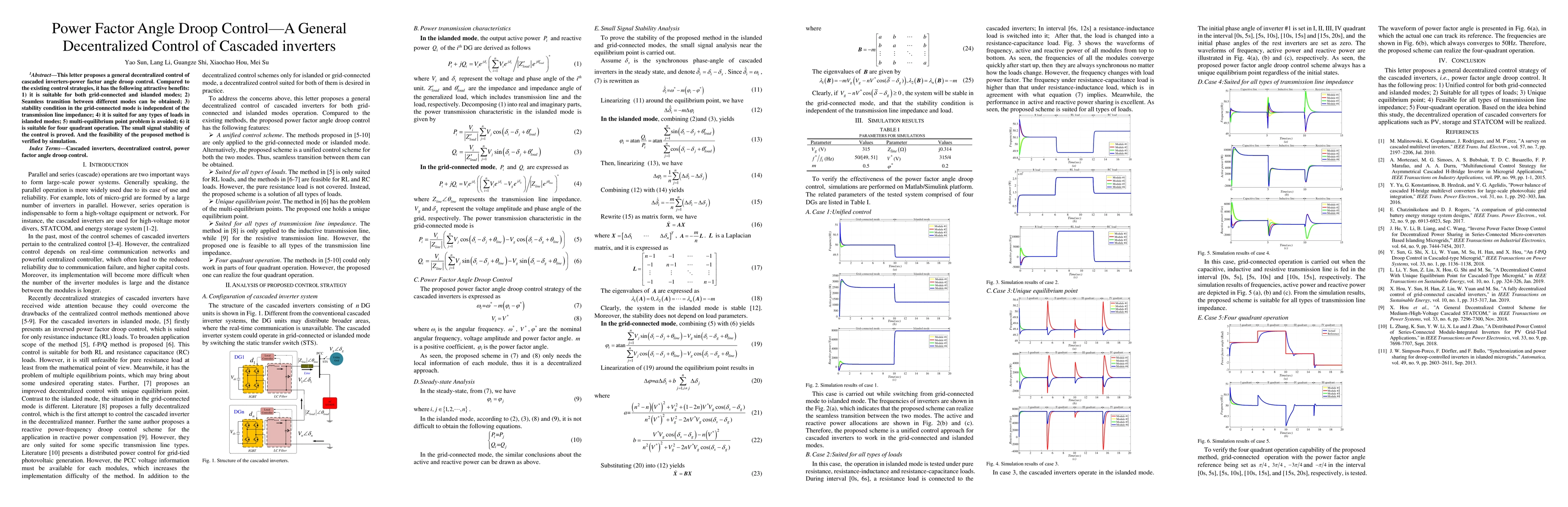 This paper proposes a decentralized control strategy called power factor angle droop control for cascaded inverters, offering benefits such as seamless mode transitions, stability independent of transmission line impedance, and suitability for various load types and four-quadrant operations. The method's small signal stability is proven, and its feasibility is confirmed through simulations.
