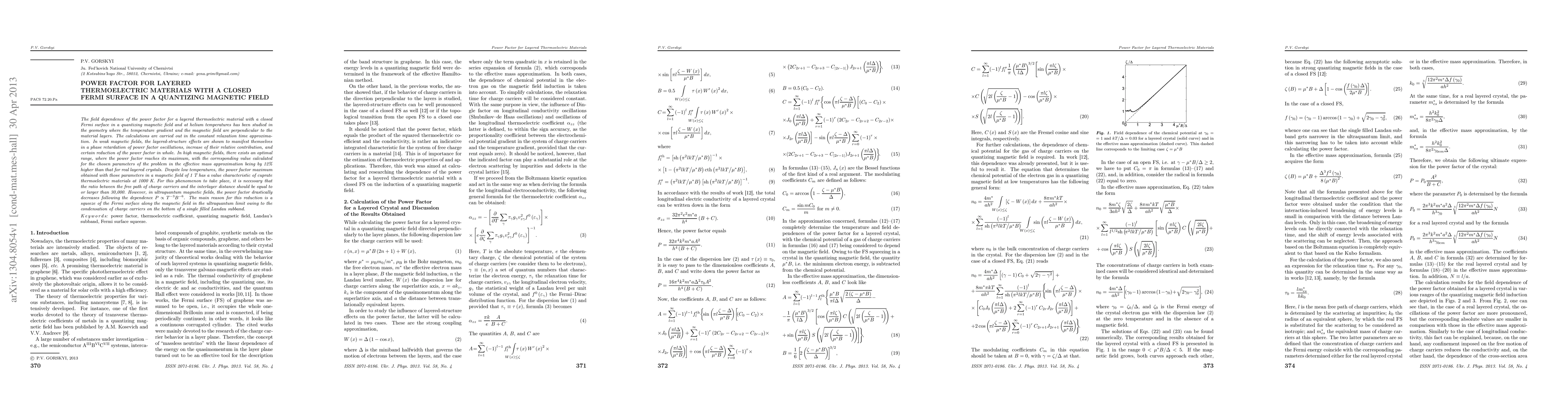 This study investigates the power factor behavior in layered thermoelectric materials with a closed Fermi surface under quantizing magnetic fields at helium temperatures. It finds that in weak fields, the layered structure causes a phase shift in power factor oscillations, while in high fields, an optimal range exists where the power factor peaks, being 12% higher than in non-layered crystals. However, in ultraquantum magnetic fields, the power factor drastically declines due to Fermi surface compression.