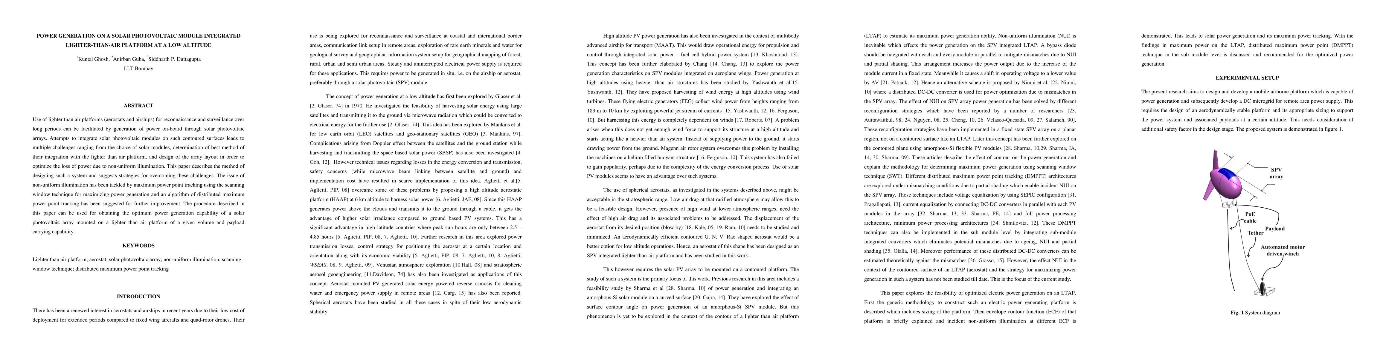 Use of lighter than air platforms (aerostats and airships) for reconnaissance and surveillance over long periods can be facilitated by generation of power on-board through solar photovoltaic arrays. Attempts to integrate solar photovoltaic modules on such contoured surfaces leads to multiple challenges ranging from the choice of solar modules, determination of best method of their integration with the lighter than air platform, and design of the array layout in order to optimize the loss of power due to non-uniform illumination. This paper describes the method of designing such a system and suggests strategies for overcoming these challenges. The issue of non-uniform illumination has been tackled by maximum power point tracking using the scanning window technique for maximizing power generation and an algorithm of distributed maximum power point tracking has been suggested for further improvement. The procedure described in this paper can be used for obtaining the optimum power generation capability of a solar photovoltaic array mounted on a lighter than air platform of a given volume and payload carrying capability.