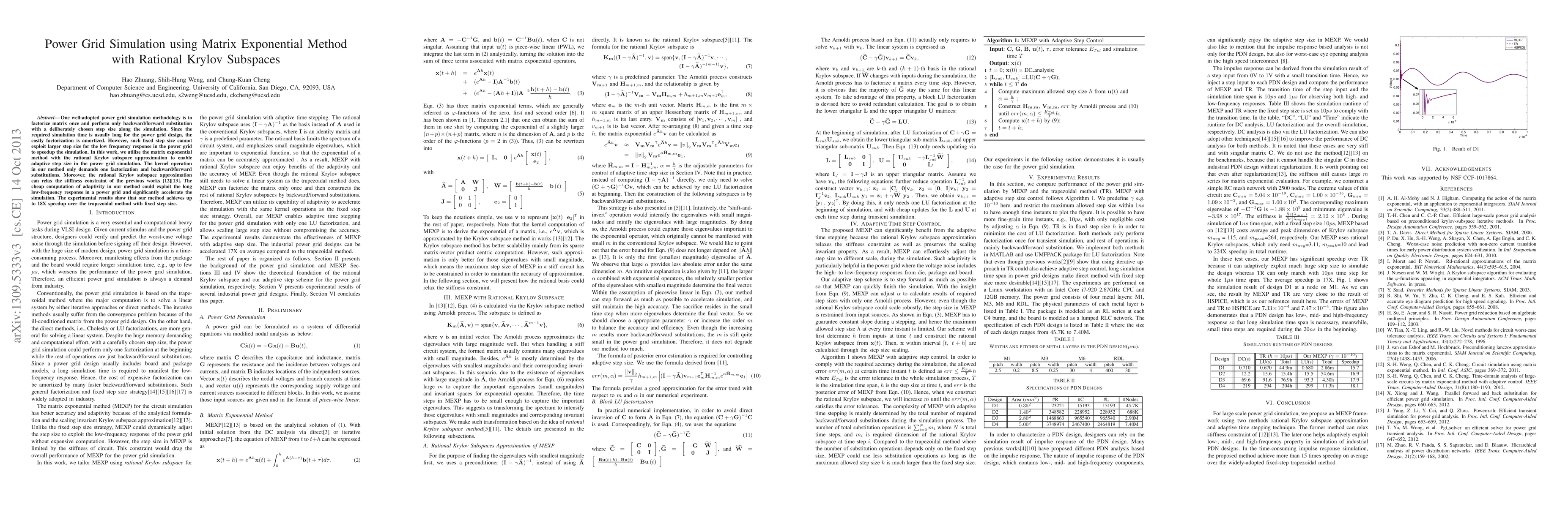 This paper proposes an adaptive power grid simulation method using the matrix exponential with rational Krylov subspaces, enabling variable step sizes and reducing simulation time. The method achieves up to 18X speedup over fixed step size methods, effectively handling low frequency responses.