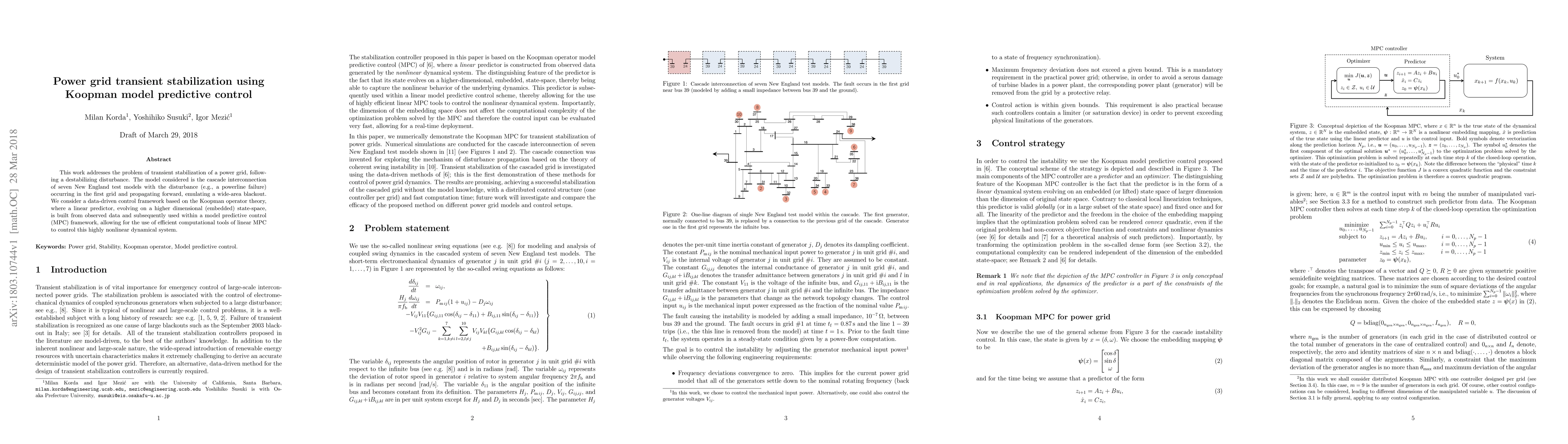 This work addresses the problem of transient stabilization of a power grid, following a destabilizing disturbance. The model considered is the cascade interconnection of seven New England test models with the disturbance (e.g., a powerline failure) occurring in the first grid and propagating forward, emulating a wide-area blackout. We consider a data-driven control framework based on the Koopman operator theory, where a linear predictor, evolving on a higher dimensional (embedded) state-space, is built from observed data and subsequently used within a model predictive control (MPC) framework, allowing for the use of efficient computational tools of linear MPC to control this highly nonlinear dynamical system.