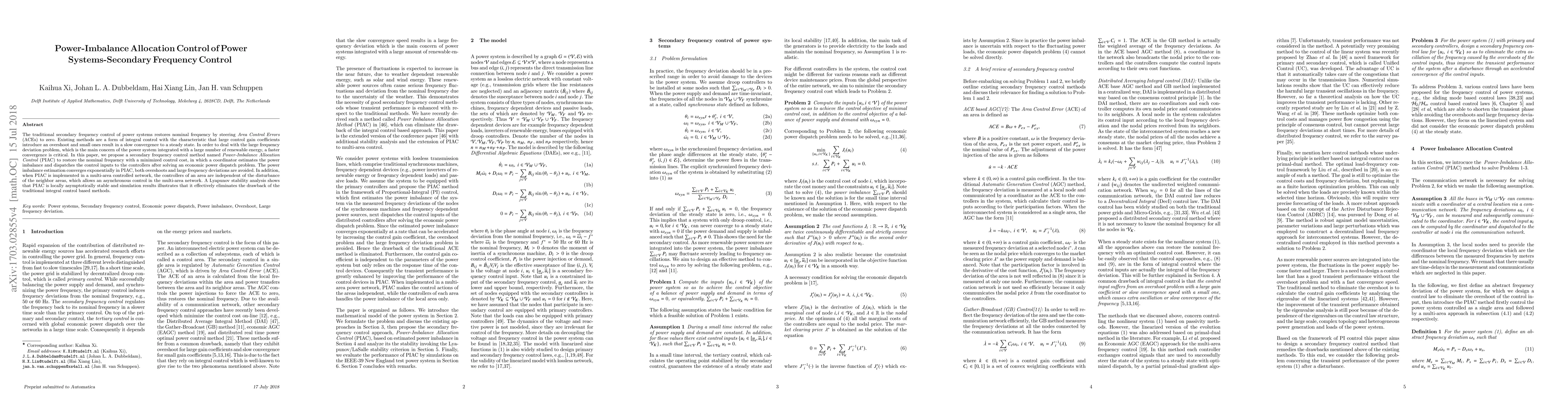 This paper proposes a Power-Imbalance Allocation Control (PIAC) method for secondary frequency control in power systems, aiming to achieve faster convergence and minimize control cost. PIAC avoids overshoots and large frequency deviations, and enables asynchronous control in multi-area networks.