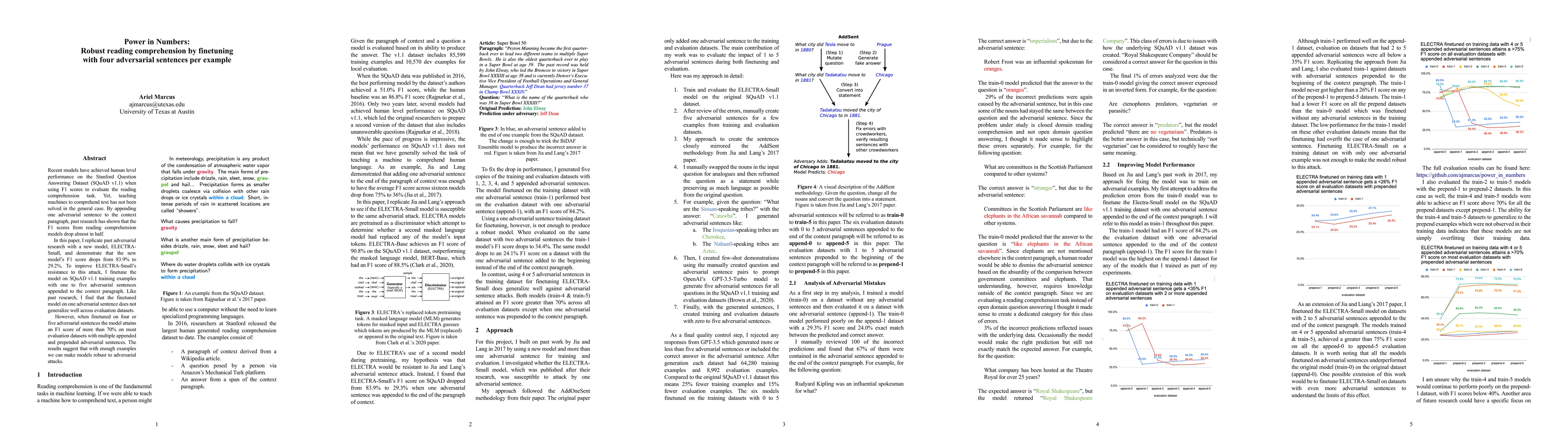 Recent models have achieved human level performance on the Stanford Question Answering Dataset when using F1 scores to evaluate the reading comprehension task. Yet, teaching machines to comprehend text has not been solved in the general case. By appending one adversarial sentence to the context paragraph, past research has shown that the F1 scores from reading comprehension models drop almost in half. In this paper, I replicate past adversarial research with a new model, ELECTRA-Small, and demonstrate that the new model's F1 score drops from 83.9% to 29.2%. To improve ELECTRA-Small's resistance to this attack, I finetune the model on SQuAD v1.1 training examples with one to five adversarial sentences appended to the context paragraph. Like past research, I find that the finetuned model on one adversarial sentence does not generalize well across evaluation datasets. However, when finetuned on four or five adversarial sentences the model attains an F1 score of more than 70% on most evaluation datasets with multiple appended and prepended adversarial sentences. The results suggest that with enough examples we can make models robust to adversarial attacks.